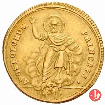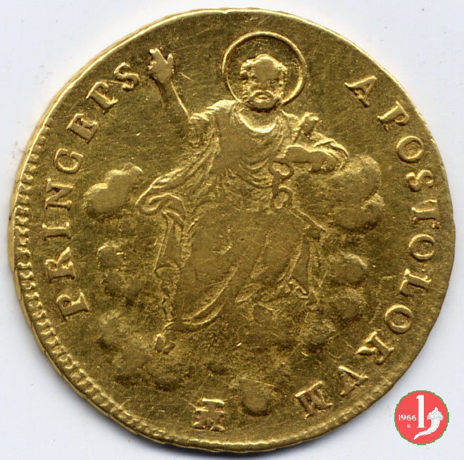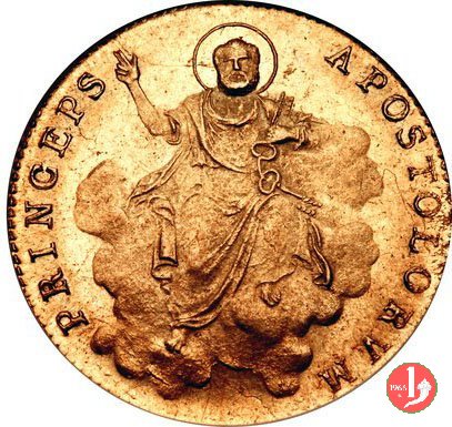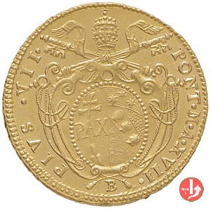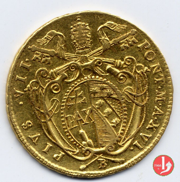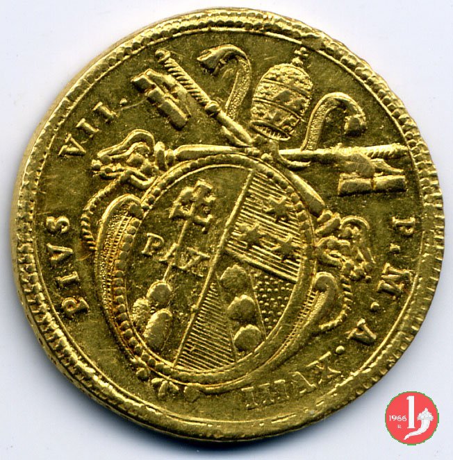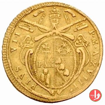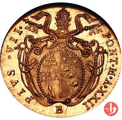 Stemma ovale in cornice con fiore in basso, sormontato da tiara e chiavi; attorno, da sinistra in b.: PIVS VII - PON • M • A • e l'anno del pontificato seguito da punto; sotto, il segno di Zecca. San Pietro seduto su nubi; attorno, APOSTOLORUM - PRINCEPS; in esergo, armetta cardinalizia semiovale.