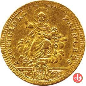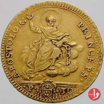 Pianta di giglio; inizio della leggenda da sinistra in basso. FLORET • IN • DOMO - DOMINI * - Esergo: millesimo San Pietro nimbato seduto su nubi; inizio della leggenda da sinistra in basso. APOSTOLOR : - PRINCEPS • - Esergo: • P • - 30 ai lati di armetta prelatizia con cappello del presidente delle zecche