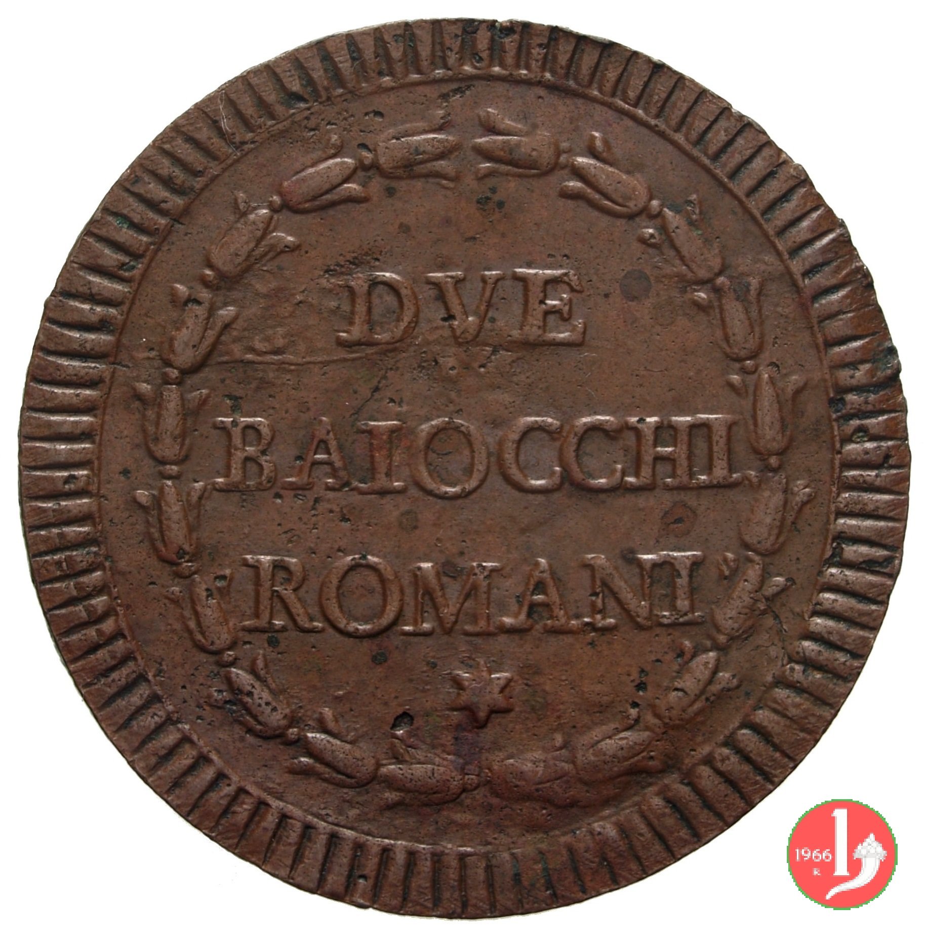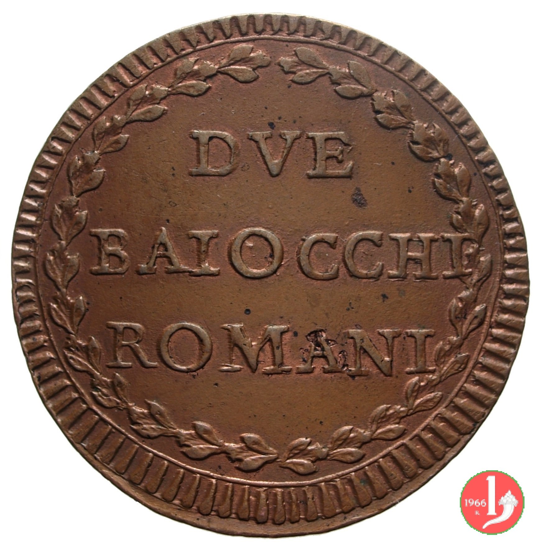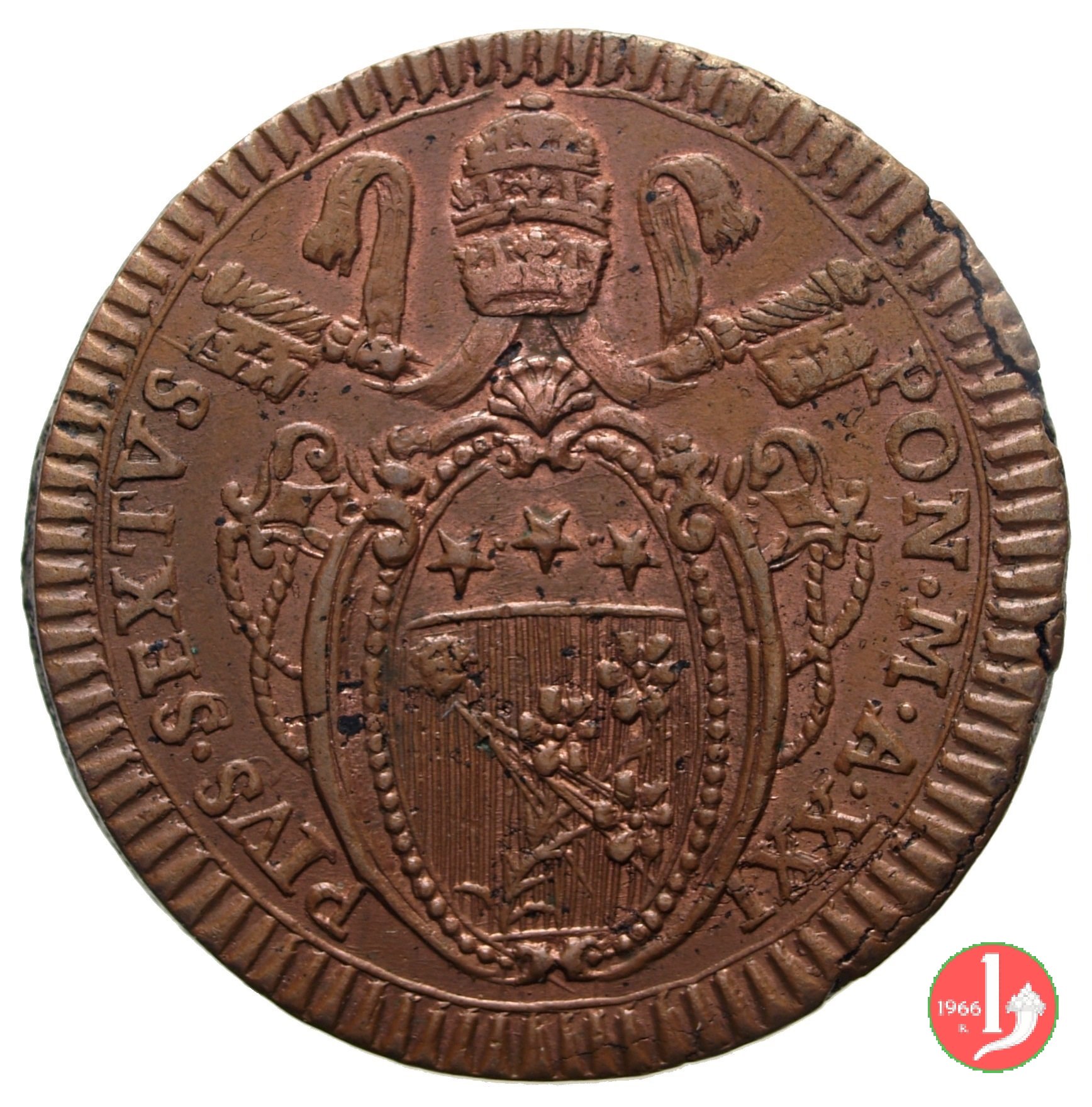Stemma ovale in cornice, chiavi con dopppi cordoni; inizio della leggenda da sinistra in basso: PIUS SEXTUS - PON • M • A • (anno di pontificato) DVE || BAIOCCHI || ROMANI || * in corona di fiordalisi.