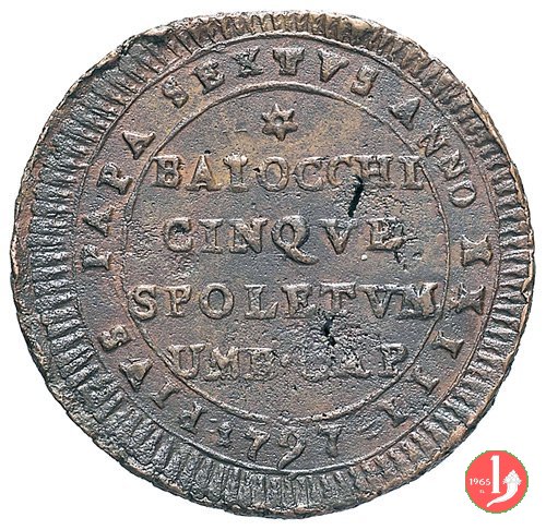 * || BAIOCCHI || CINQVE || SPOLETVM || VMB • CAP - Inizio della leggenda da sinistra in basso. PIVS PAPA SEXTVS ANNO XXIII - In basso: = 1797 = Busto della Madonna a sinistra. Inizio della leggenda da sinistra in basso. SANCTA DEI - GENITRIX - In basso: T • M