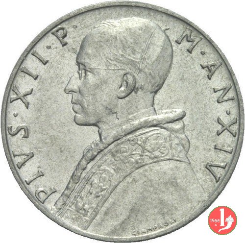 Busto del Papa rivolto a sinistra con legenda: Pivs •XII •P •M •An •(anno di pontificato) Figura allegorica della Prudenza con uno specchio in mano, intorno: Città del Vaticano A sinistra il millesimo e a destra il nominale; in esergo PRVDENTIA