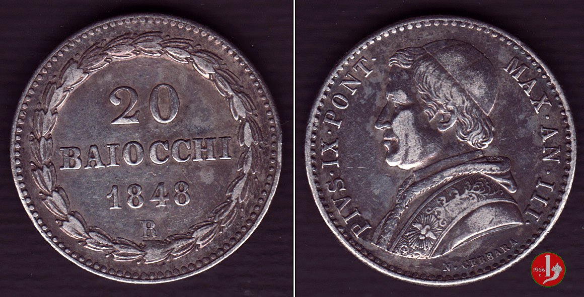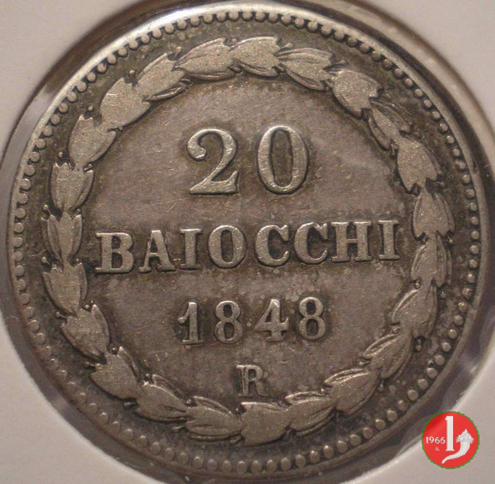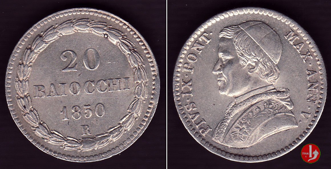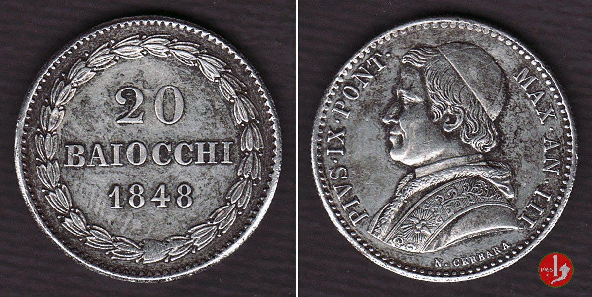 Parlano di questa moneta sul forum in: 20 baiocchi 1850.... in oro: ne sapete qualcosa?, 20 Baiocchi 1848 Anno II Roma e Anno III Bologna, Notizie, Pio IX - 20 baiocchi 1848 senza segno di zecca.