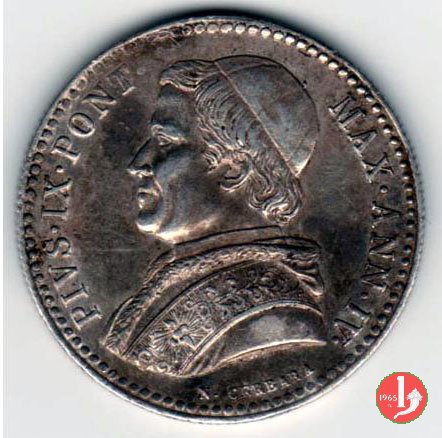 Busto a sinistra, con zucchetto, mozzetta e stola. Attorno PIVS • IX • PONT • MAX • AN • anno di pontificato in numeri romani. Sotto: N. CERBARA All'interno di una corona di alloro, in quattro righe, il valore, la data ed il segno della zecca.
