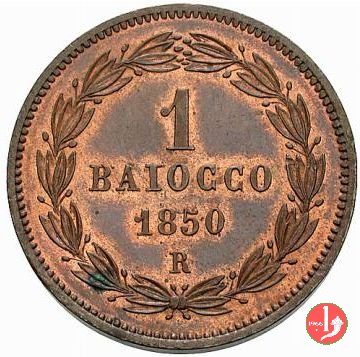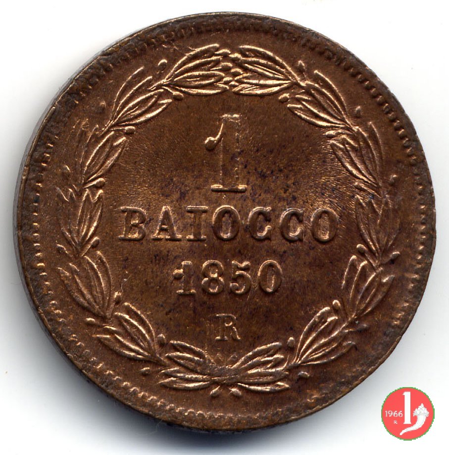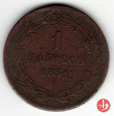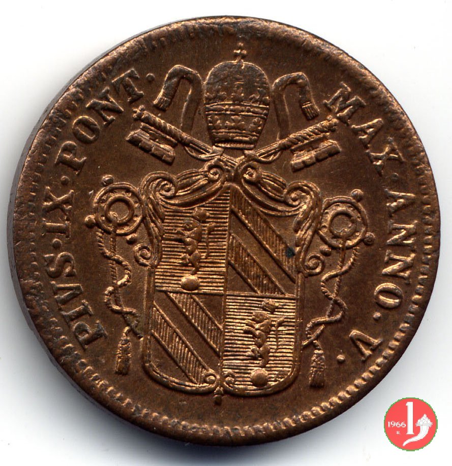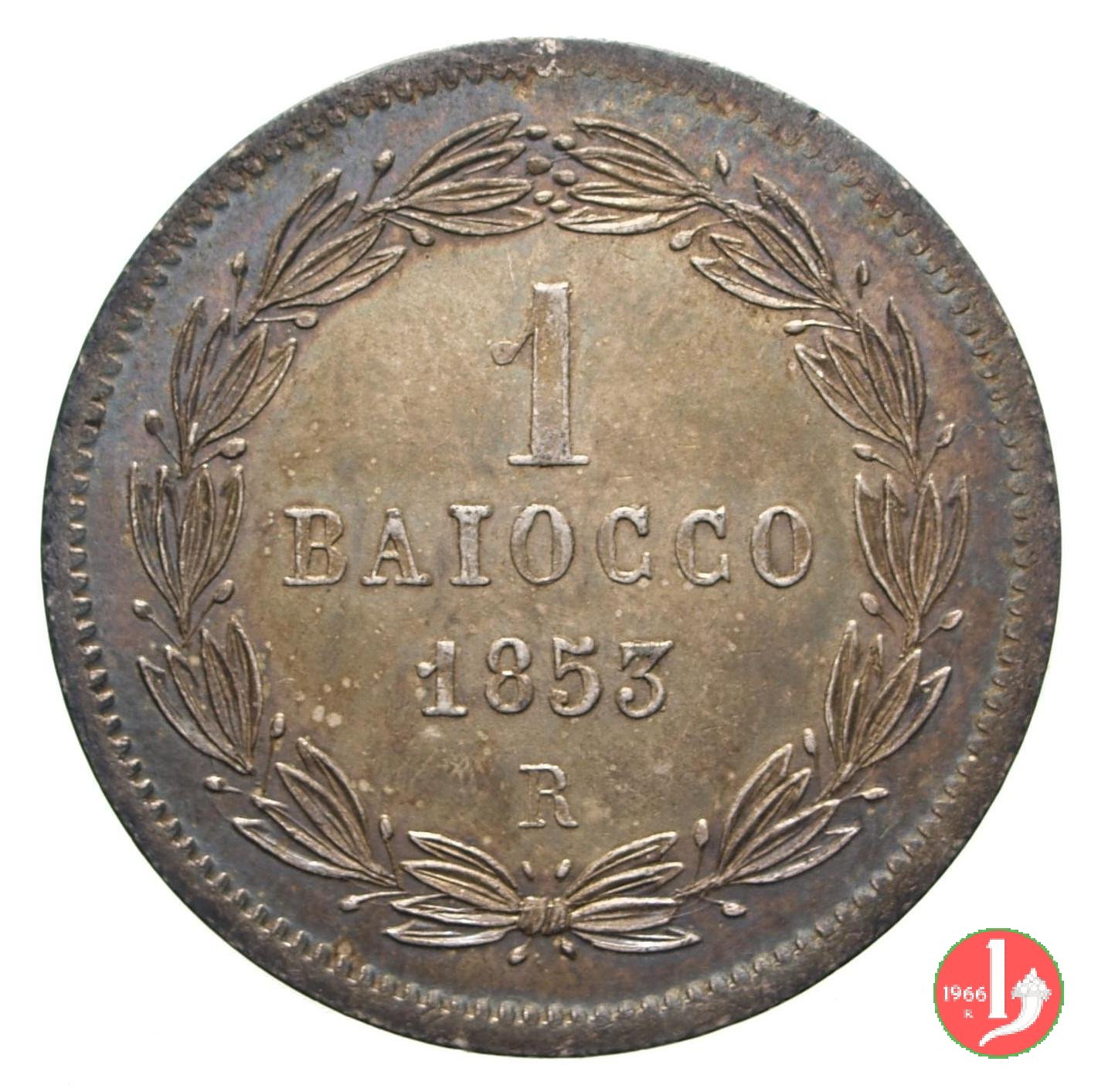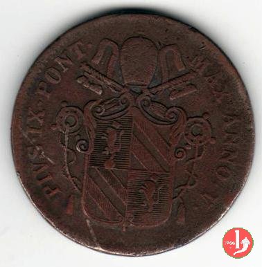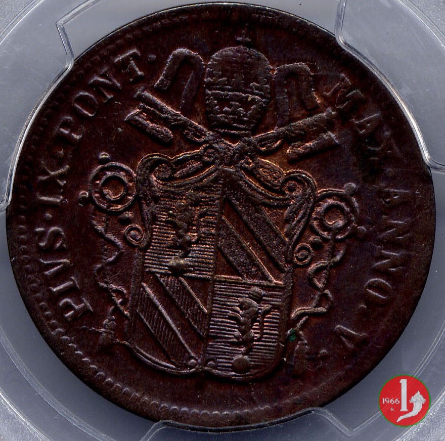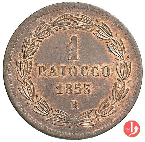 Stemma, ornato e sormontato da tiara papale e da chiavi incrociate. In basso indicazione dell'autore Nicola Cerbara (N • C •). Intorno PIVS • IX • PON • MAX • ANNO •, anno di pontificato in numeri romani e •. Al'interno di una corona di alloro, su quattro righe: indicazione del valore 1, BAIOCCO, millesimo e segno di zecca.