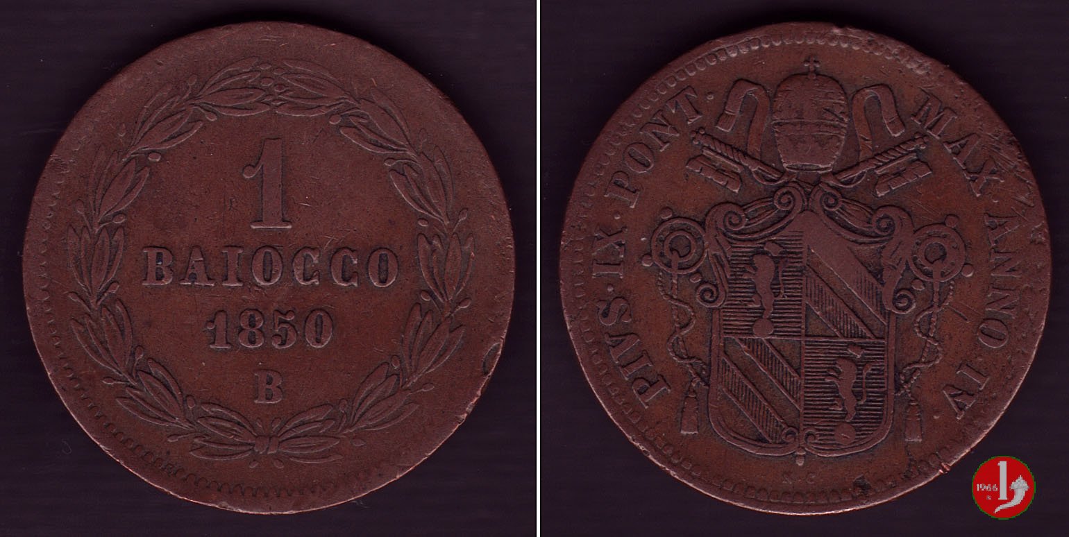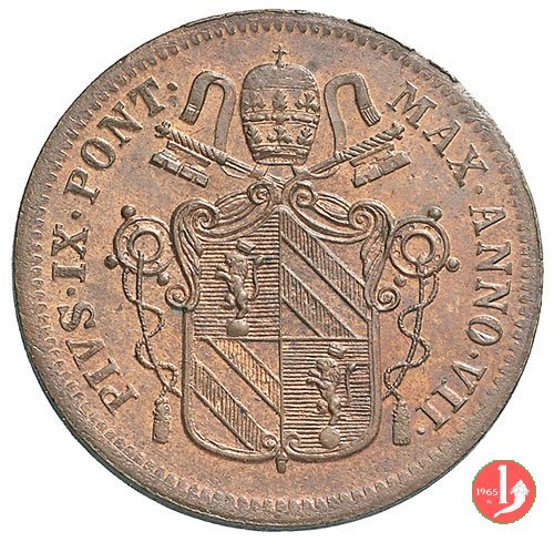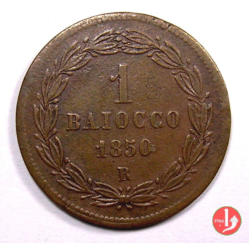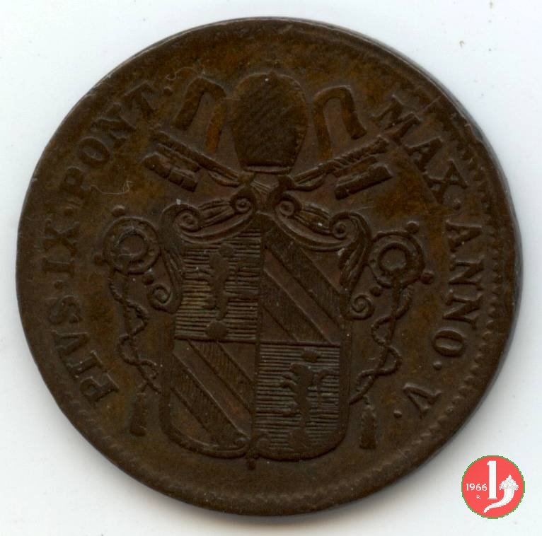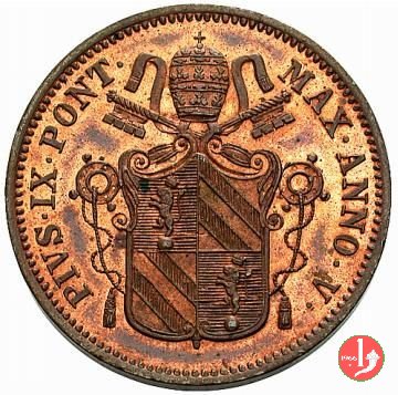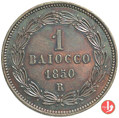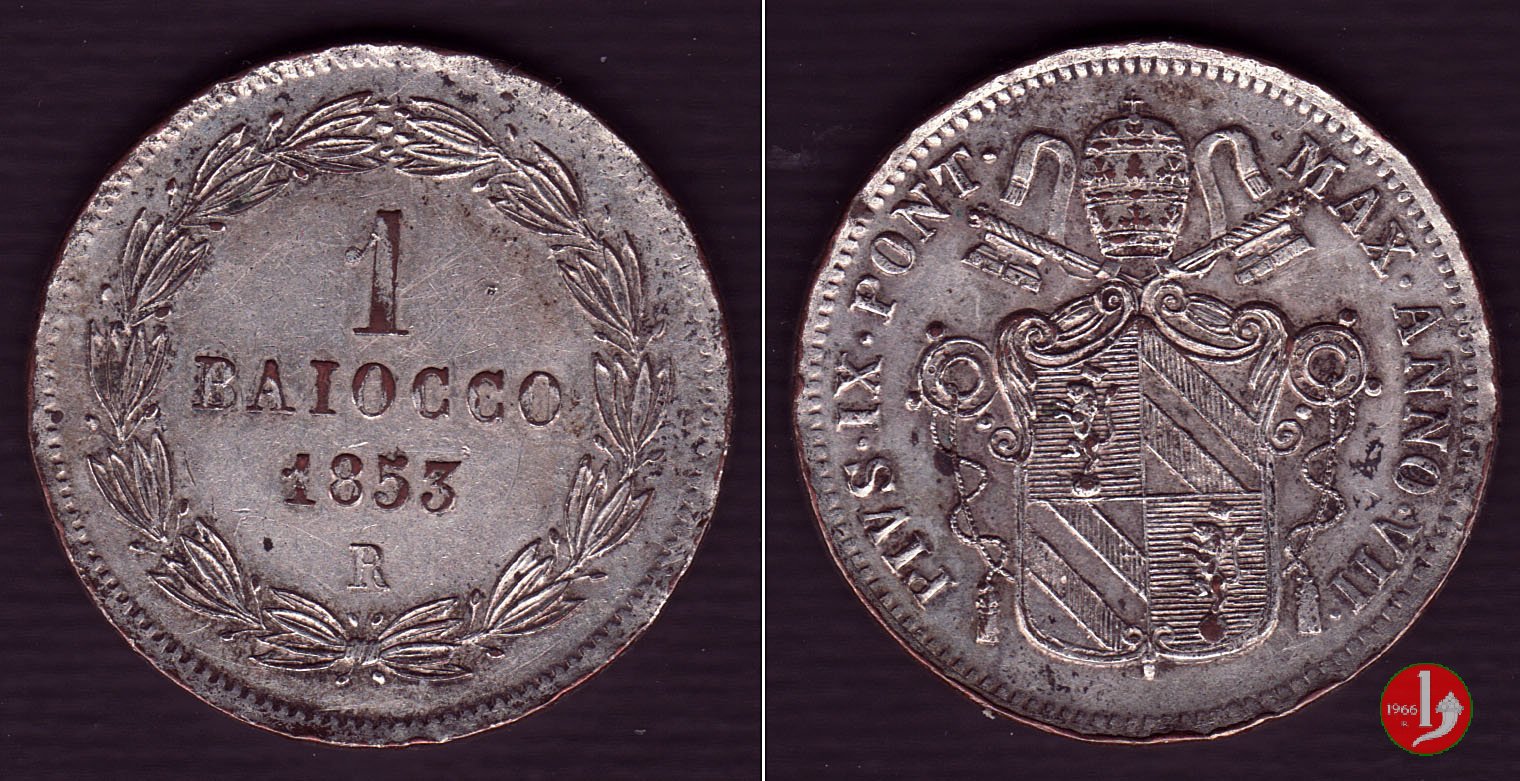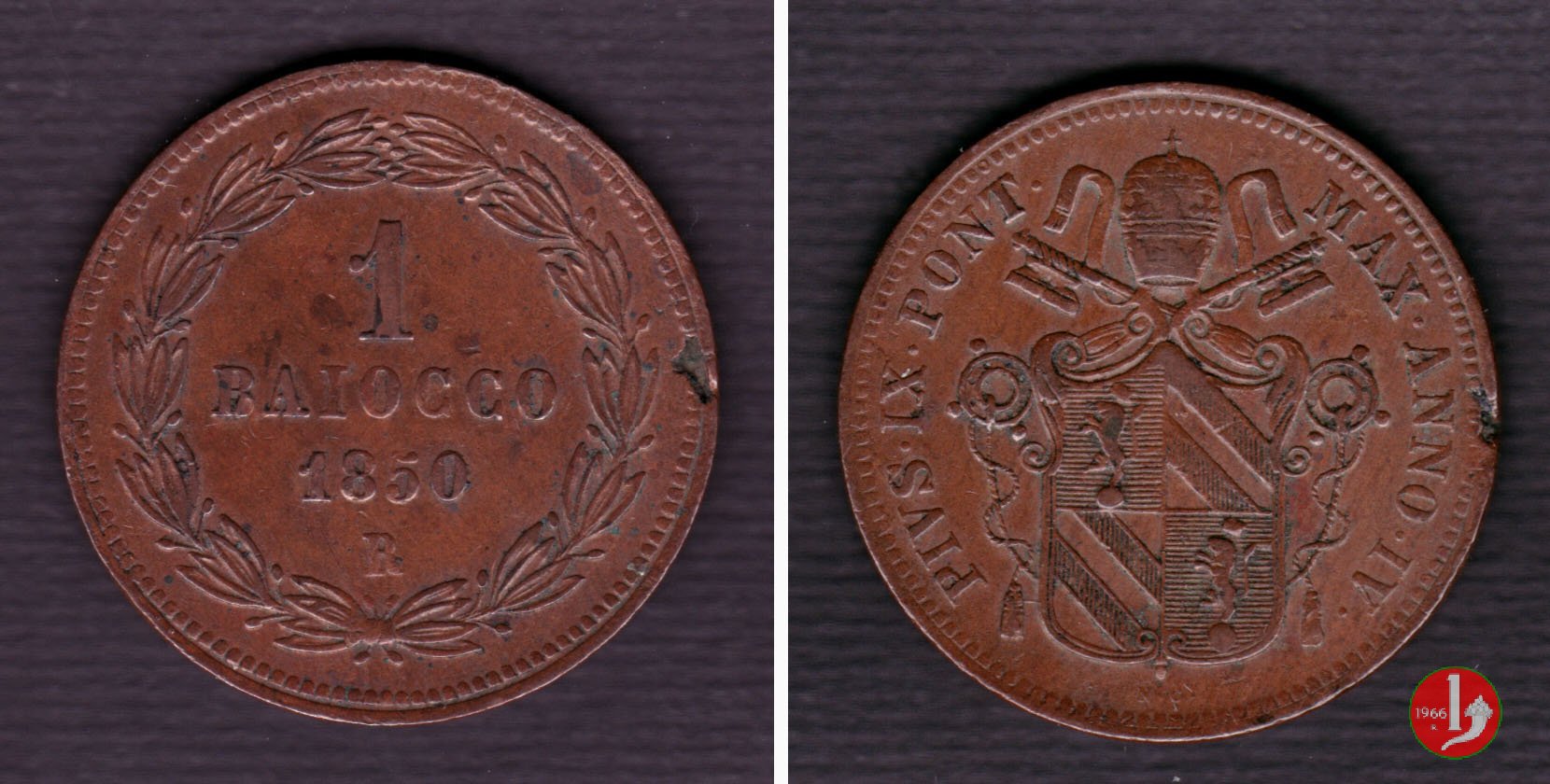 Stemma, ornato e sormontato da tiara papale e da chiavi incrociate. In basso indicazione dell'autore Nicola Cerbara (N • C •). Intorno PIVS • IX • PON • MAX • ANNO •, anno di pontificato in numeri romani e •. Al'interno di una corona di alloro, su quattro righe: indicazione del valore 1, BAIOCCO, millesimo e segno di zecca.