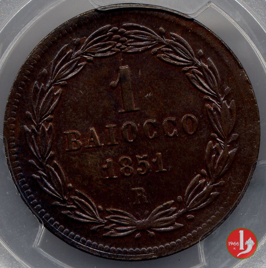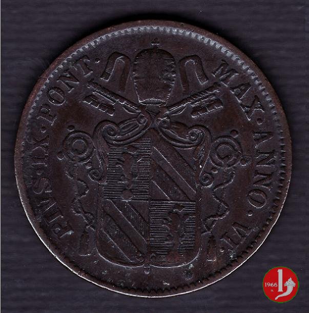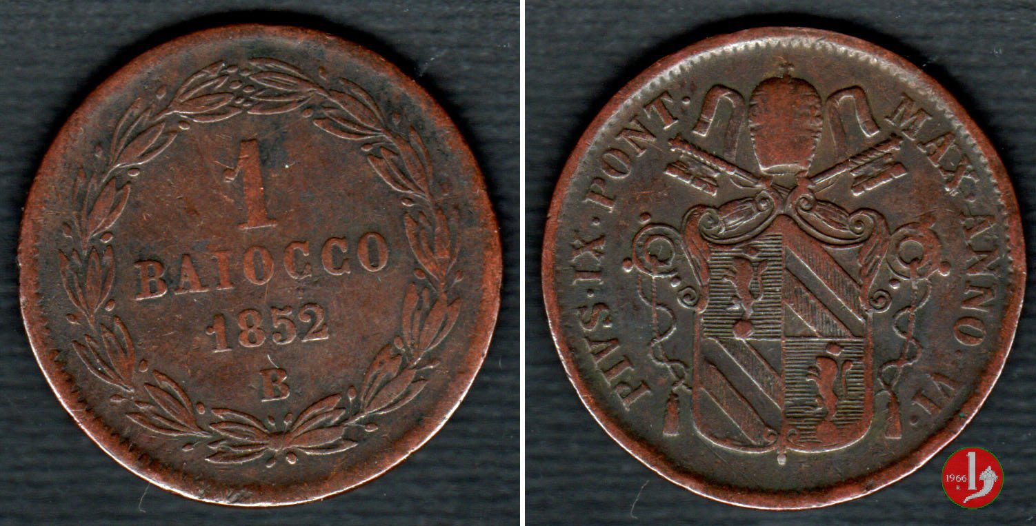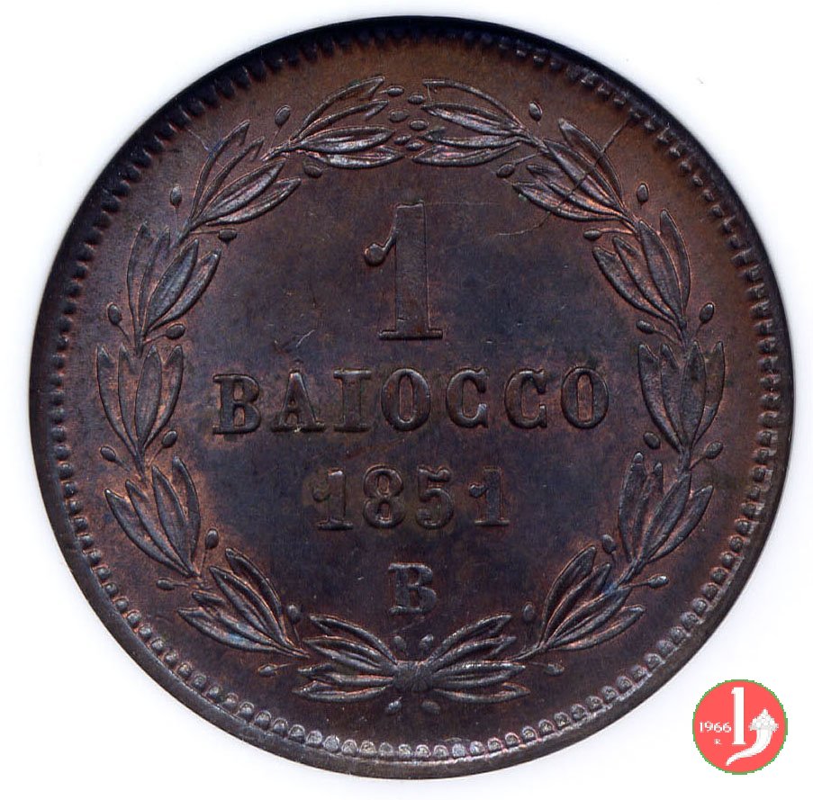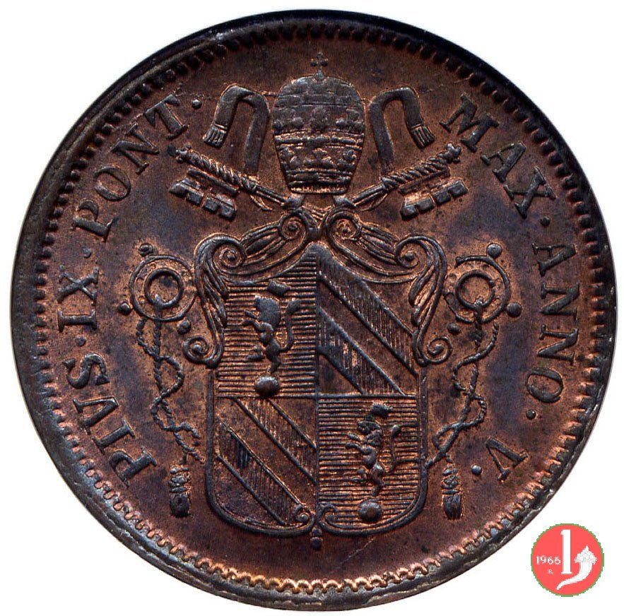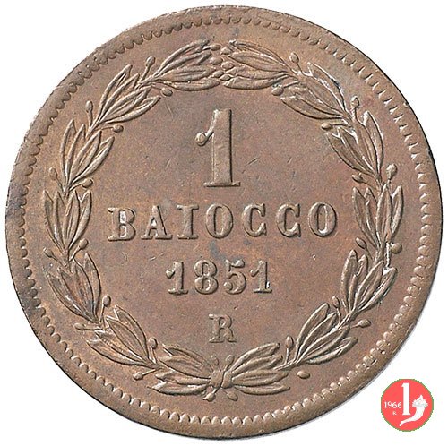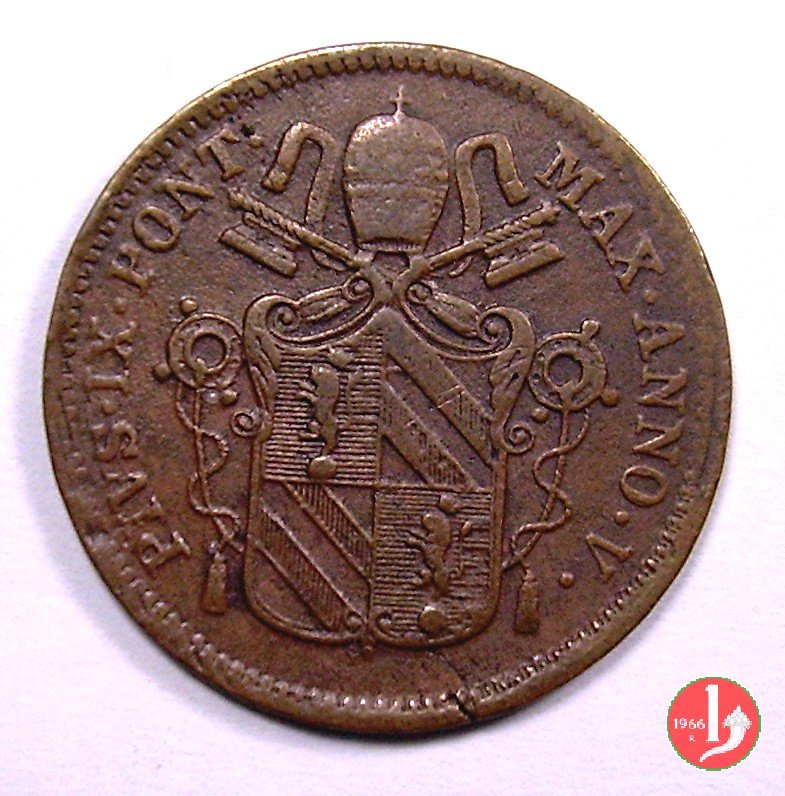Stemma, ornato e sormontato da tiara papale e da chiavi incrociate. In basso indicazione dell'autore Nicola Cerbara (N • C •). Intorno PIVS • IX • PON • MAX • ANNO •, anno di pontificato in numeri romani e •. Al'interno di una corona di alloro, su quattro righe: indicazione del valore 1, BAIOCCO, millesimo e segno di zecca.