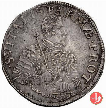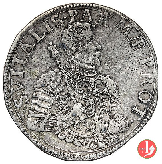 Busto corazzato e drappeggiato del Duca a destra, intorno RAN • FAR • PAR • ET • PLA • DVX • VI. Sotto il busto indicazione dello zecchiere ( • S • T • ). Mezza figura di San Vitale a destra, con corazza riccamente ornata, scettro nella mano destra e sinistra sullelsa della spada, intorno • S • VITALIS • PARMÆ • PROT.