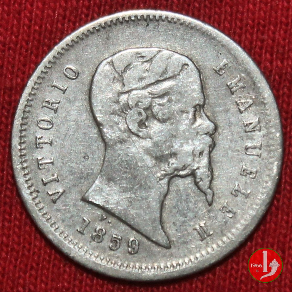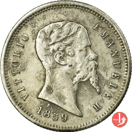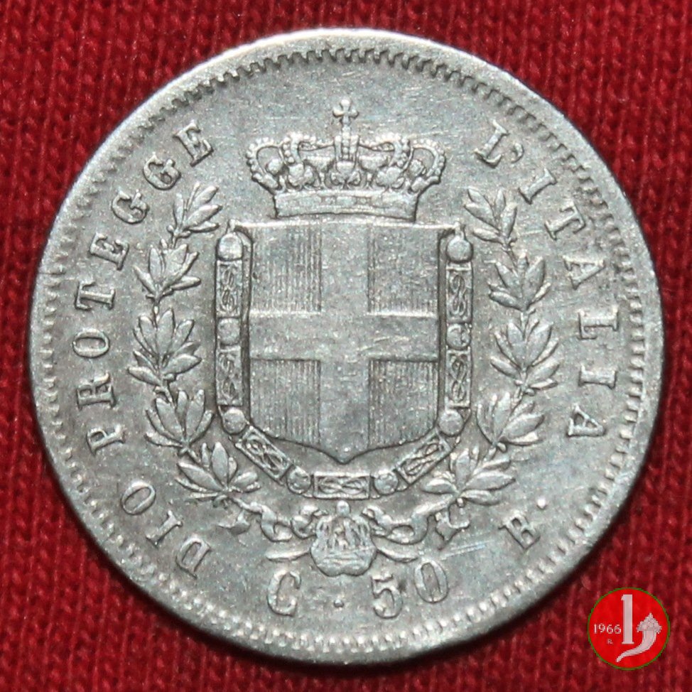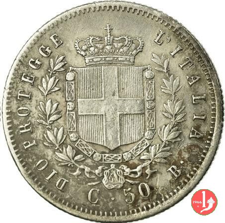 Volto del Re a destra. Ai lati lungo il bordo VITTORIO EMANUELE II. Sotto il collo del Re indicazione dell' autore (F di Ferraris) e millesimo (1859). Stemma del casato Savoia con il collare dell'annunziata tra rami di lauro. Intorno, DIO PROTEGGE L'ITALIA. In basso indicazione del valore (C. 50), a ore 4 segno di zecca (B).