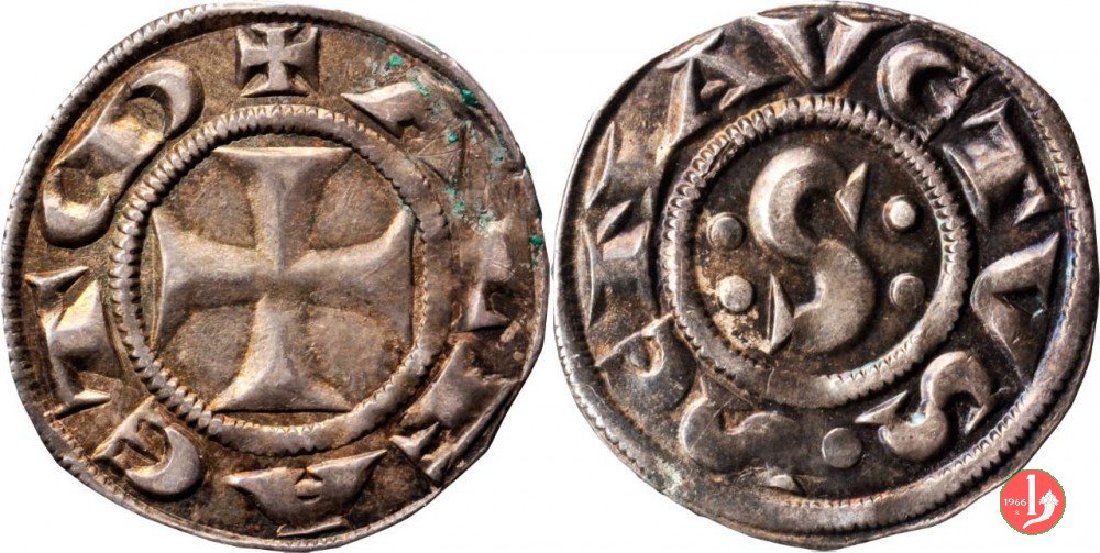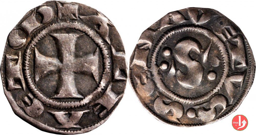 4 L'evoluzione epigrafica che si presenta in questo grosso,ovvero la S dritta in leggenda, è forse quella piú notevole nell' ambito dei grossi primitivi. si abbandona, infatti, l' utilizzo di due punzoni circolari per la realizzazione della S, in favore di uno inciso all' uopo su misura, che entra quindi verticalmente tra il cerchio interno e quello esterno. in questa tipologia si nota un notevole abbassamento di peso (1,4g-1,7g contro 1,65-1,85 dei precedenti)