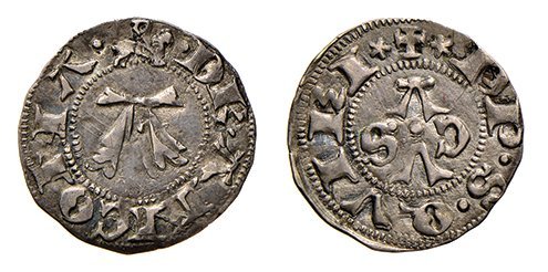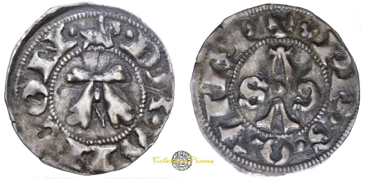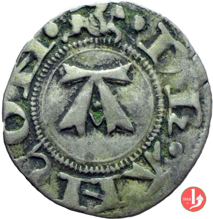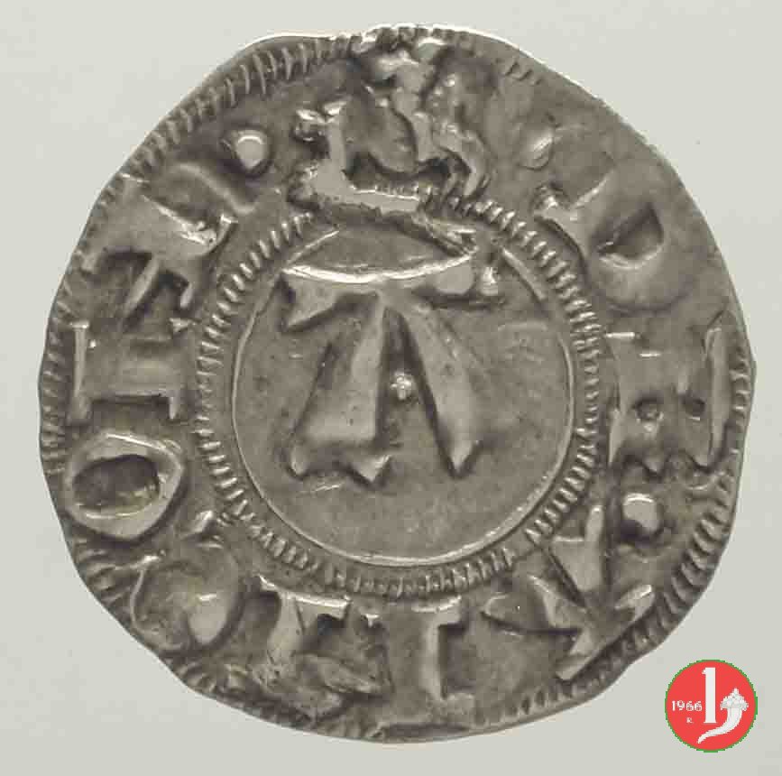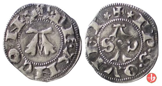 | Secolo XIV. I Bolognini di questo periodo sono stati divisi in 5 tipi principali secondo la peculiarità del Dritto: + 1° t.: nel campo grande A sormontata da un rosone - + 2° t.: nel campo A accostata da rosoni / rosette / stelle - + 3° t.: nel campo grande A fogliata accostata da 4 rosoni /stelle - + 4° t.: cavaliere a destra; nel campo grande A - + 5° t.: cavaliere a destra; nel campo grande A con 4 stelle attorno. | |||||||||||||||||||||||||||||||||||