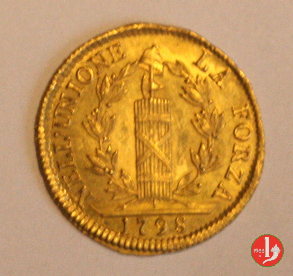 Fascio con scure sormontato da berretto frigio tra due rami di lauro. Intorno, NELL'UNIONE LA FORZA. In esergo indicazione del millesimo. Figura femminile con corona turrita, lancia nella mano destra e braccio sinistro adagiato su di uno scudo crociato seduta verso sinistra su un piedistallo con livella; allegoria della Repubblica basata sull'uguaglianza. Sulla base dell'esergo indicazione dell'autore (H • V • per Gerolamo Vassallo) in incuso. Intorno, REPUBBL • LIGURE • ANNO • I •. In basso indicazione del valore (L • 12).