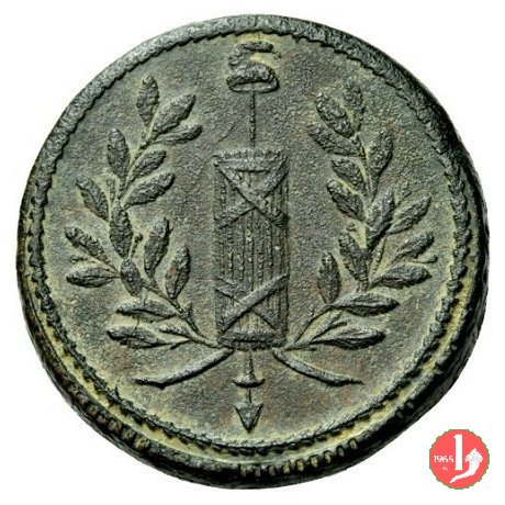 Fascio littorio (con una legatura orizzontale fra due incrociate) senza scure e con pileo a sinistra, tra due rami d'alloro con bacche sovrapposti in basso. Il tutto entro un cordone circolare.