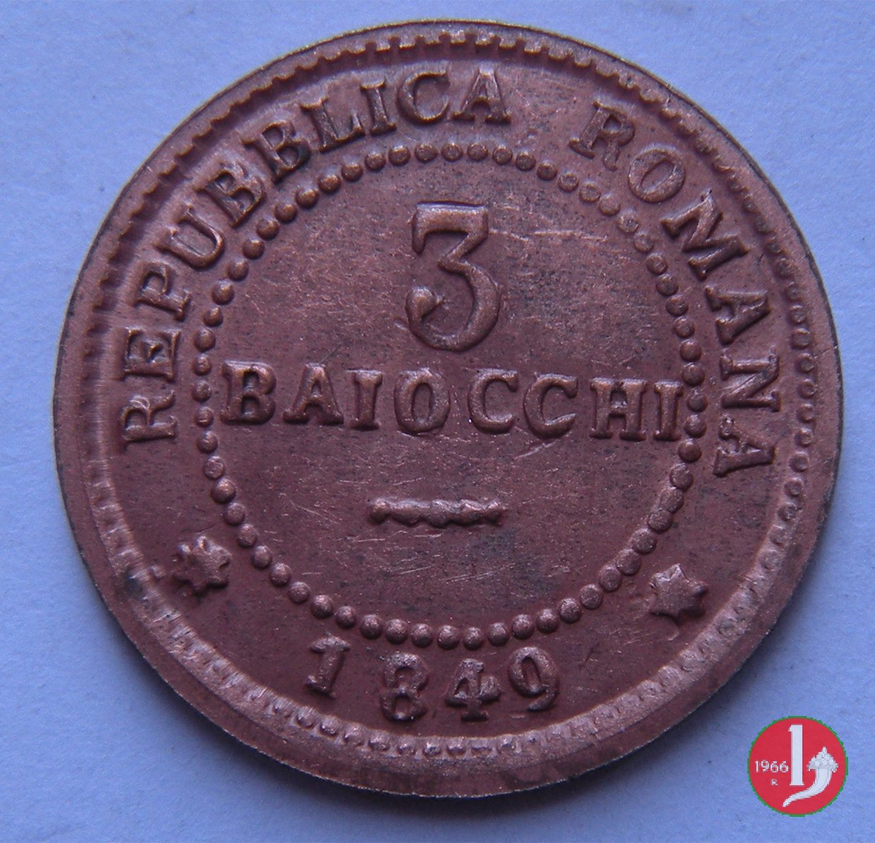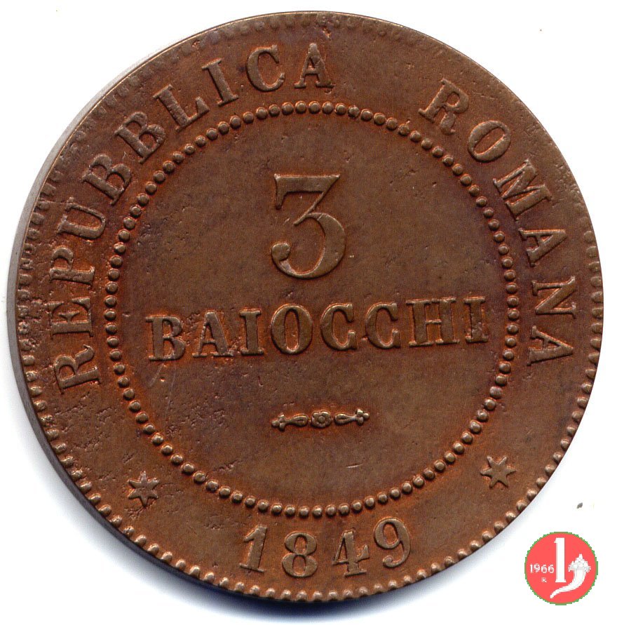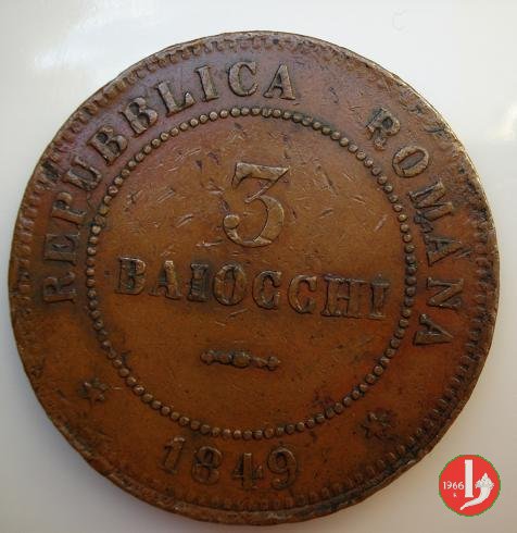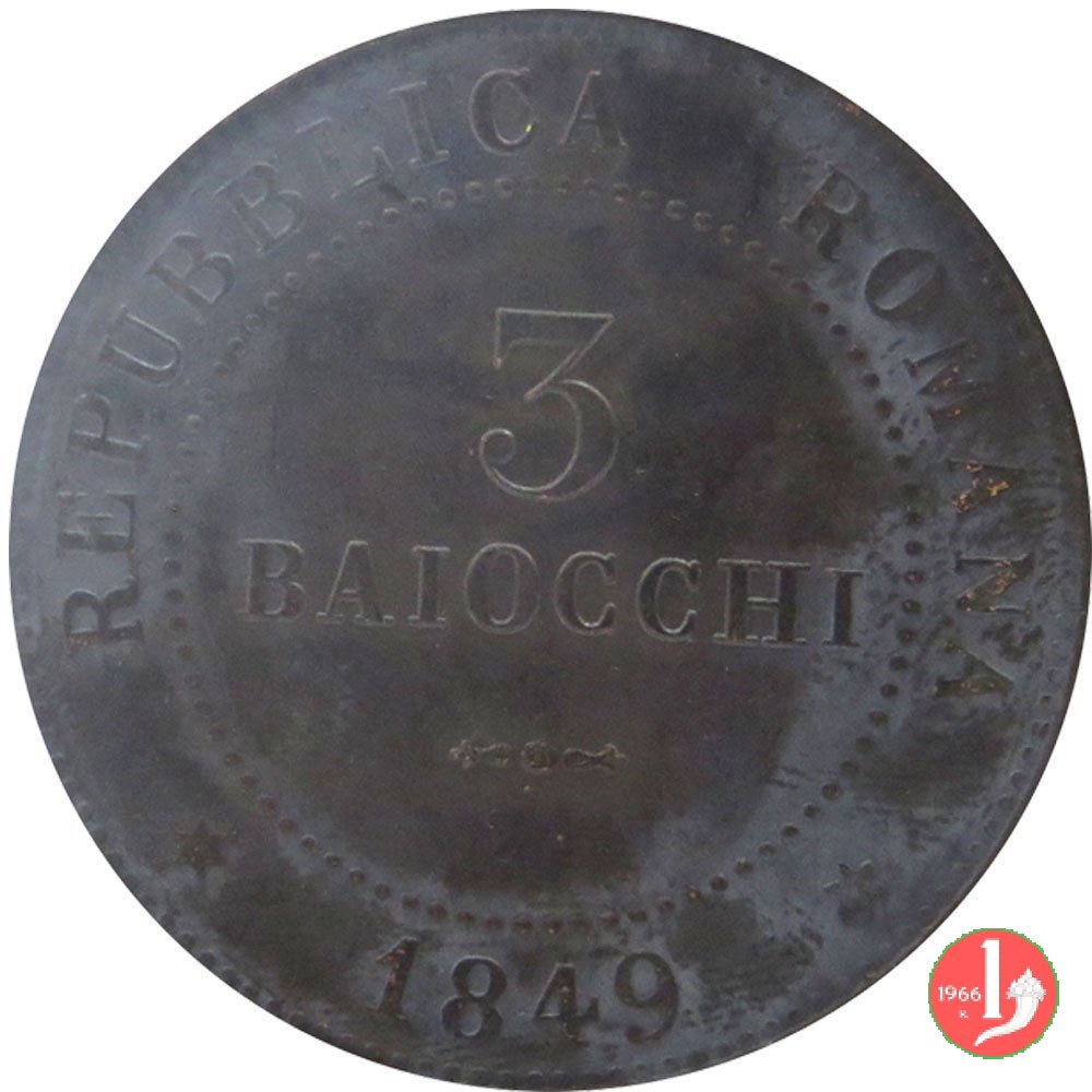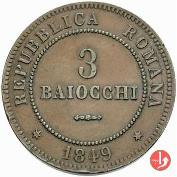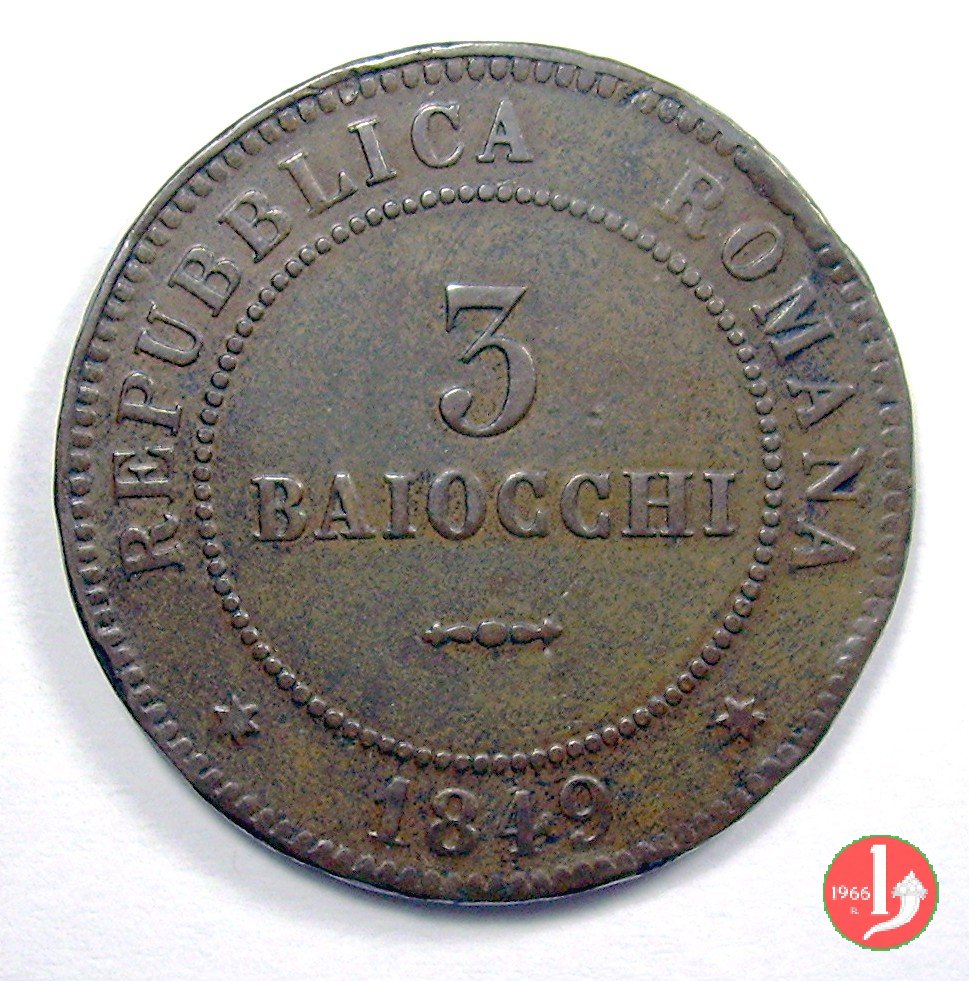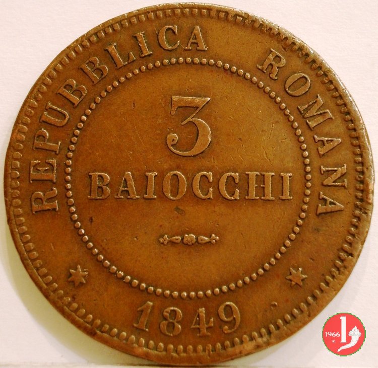 There are discussions about this coin on the forum: 3 baiocchi Repubblica Romana 1849 - ROMA, 3 "tondo" - 3 "piatto" - 3 "piccolo".