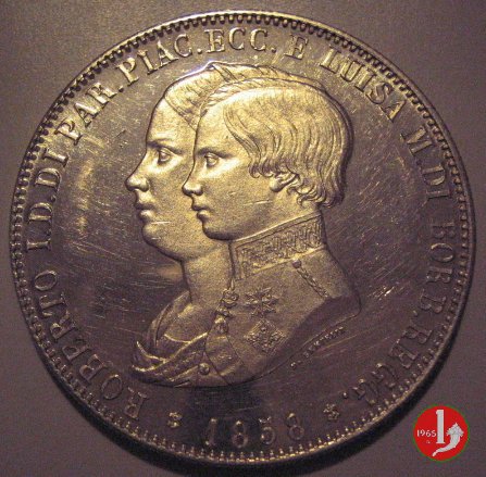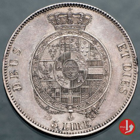 moneta da 5 lire o scudo. Due varianti principali che differiscono per le lettere poste nel secondo quarto della terza fascia dello stemma ai lati della croce d'oro posta su campo rosso (Bisanzio - Lascaris Paleologo). Nella variante piú comune (NC) sono 4 C squadrate poste specularmente due a due (c ↄ c ↄ), mentre nella variante meno comune (R2) sono E B E B. Nella versione ufficiale dello stemma dei Borbone Parma appaiono 4 Ε che è comunque a sua volta non corretto dovendo apparire 4 acciarini a forma di beta maiuscola (B) dalle iniziali del motto dei Paleologo: ΒασιλεĎŤς ΒασιλÎων, ΒασιλεĎŤων ΒασιλευĎŚντων. | |||||||||||||||