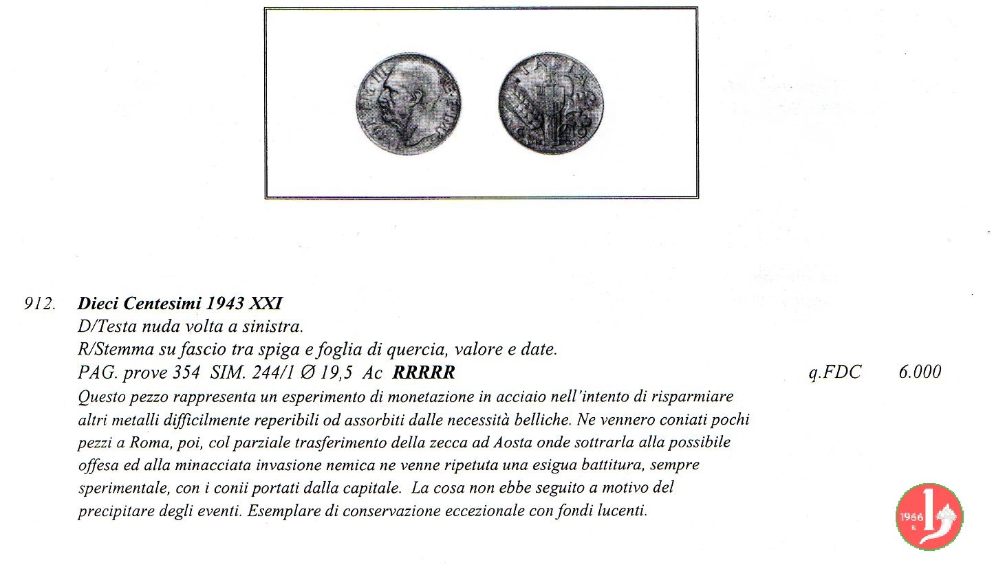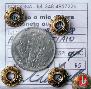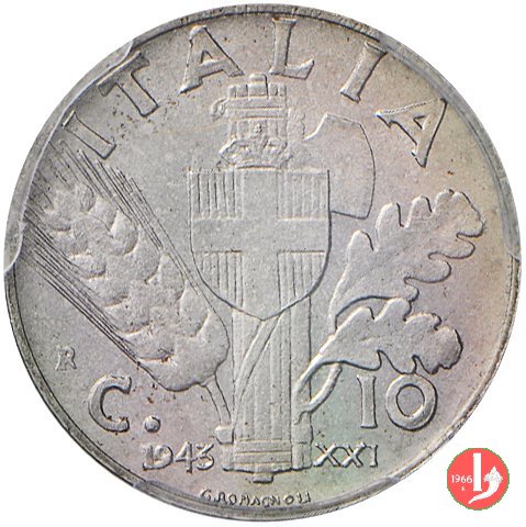 Testa nuda del Re a sinistra, intorno la scritta VITT • EM • III • RE • E • IMP •. Stemma sabaudo con corona reale sovrapposto ad un fascio. Adestra una foglia di quercia a sinistra una spiga di grano. Ai lati della base del fascio millesimo e anno dell'Era Fascista (1943 XXI); sopra l'indicazione del valore (C • 10). In alto lungo il bordo la scritta ITALIA, a ore 4 l'indicazione dell'autore (G • ROMAGNOLI) e a ore 8 il segno di zecca (R).