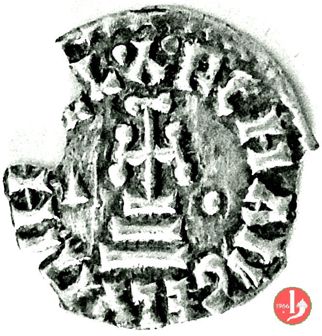 ✠PRINCEBENEBENTI, Monogramma cruciforme di Sicardo; cerchio di perline. ARCHANGELV MIHAEL Croce potenziata su tre gradini, ai latitriangolo e bisante; cerchio di perline.