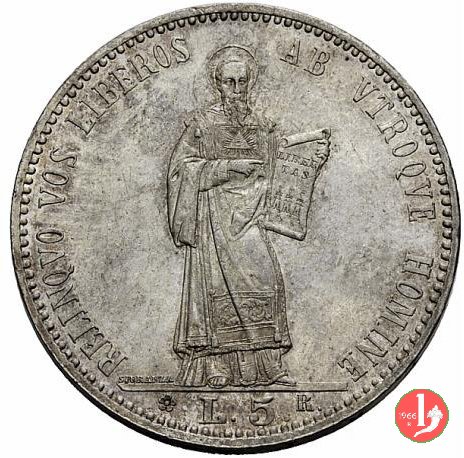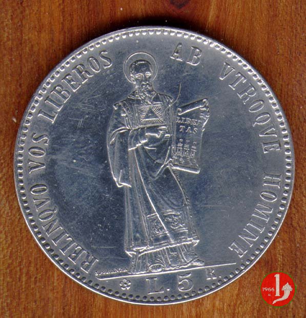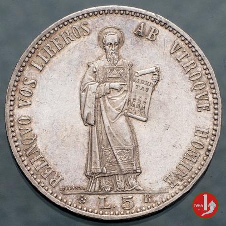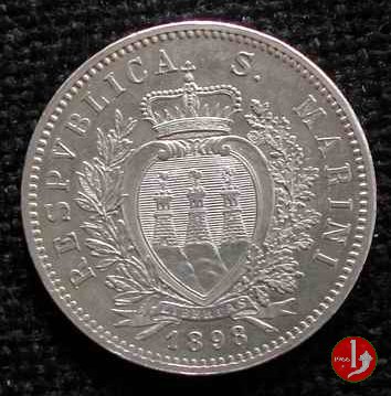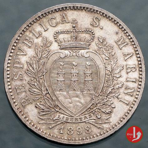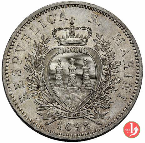 Stemma araldico di San Marino con le tre torri attorniato da un ramo di ulivo (o lauro) e uno di quercia. In alto corona simbolo della sovranità di San Marino. In basso, cartiglio recante LIBERTAS in incuso. Intorno RESPVBLICA S • MARINI. In basso, il millesimo (1898). San Marino in piedi con pergamena recante LIBERTAS sopra ai tre monti sanmarinesi. Intorno, RELINQVO VOS LIBEROS AB VTROQVE HOMINE. In esergo, indicazione del valore (L • 5) tra una rosetta a cinque petali (a sinistra) e il segno di zecca (R • a destra). Sopra la base dell'esergo a sinistra, indicazione dell'autore (SPERANZA).1