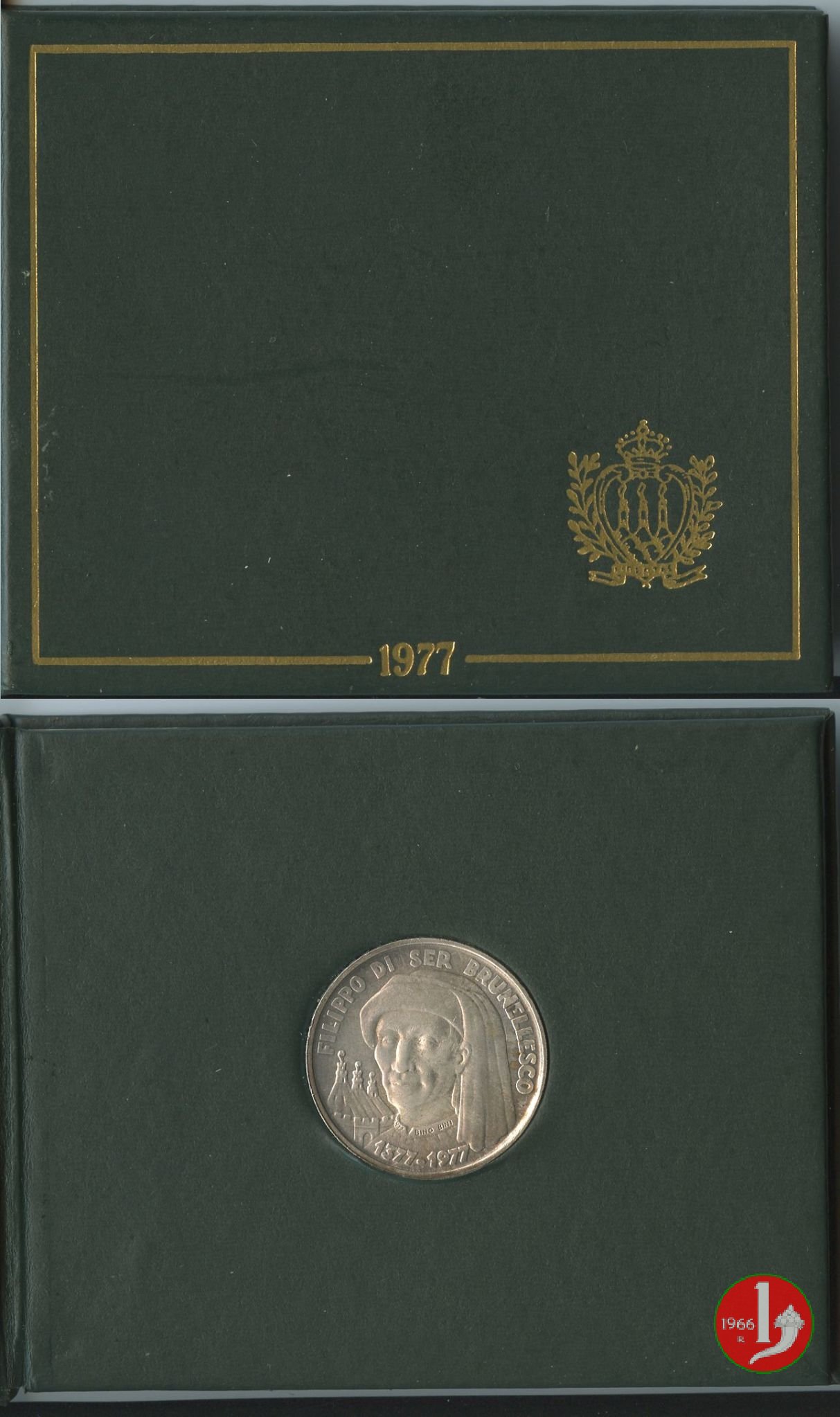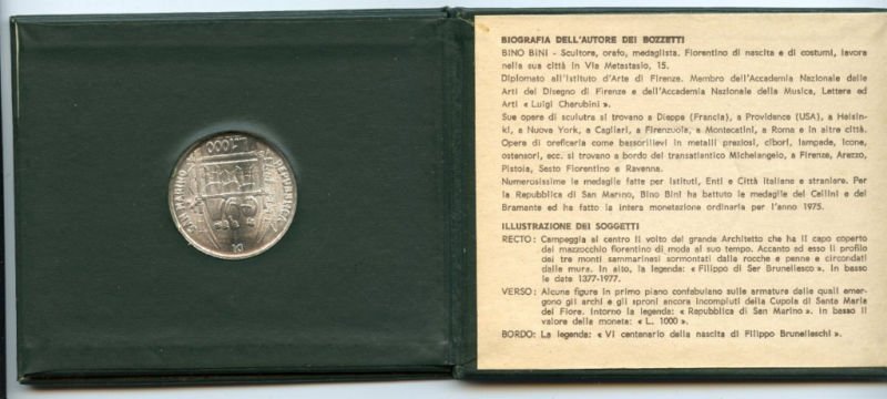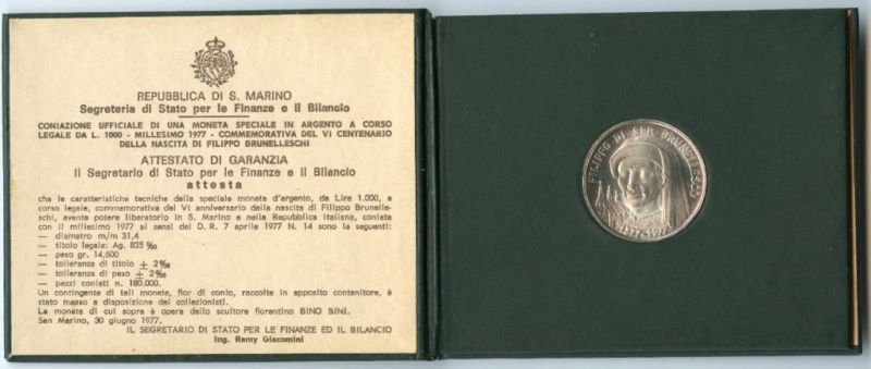 - L. 1000 - Argento 835/000, peso legale grammi 14,600, diametro 31,4 millimetri. Esemplari coniati n. 180.000 (centottantamila). RECTO: Il ritratto di Filippo Brunelleschi, Architetto Fiorentino. - Sulla sinistra del soggetto le tre torri sormontate dalle penne simbolo ufficiale della Sovranità Statale. - Sul semicerchio superiore la scritta: FILIPPO DI SER BRUNELLESCO. - Alla base i millesimi 1377 - 1977.