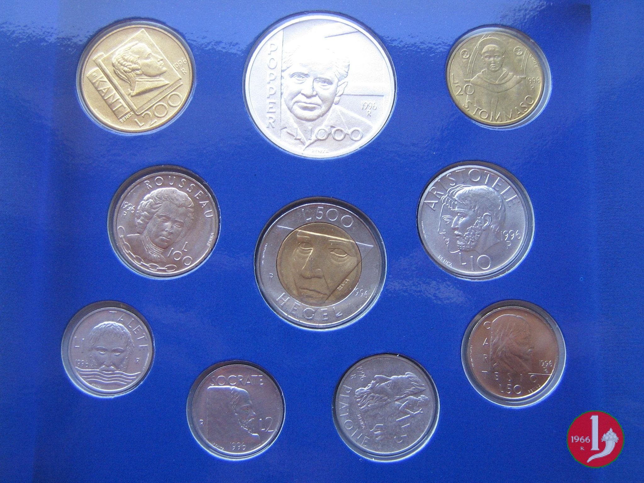 Decreto 14 giugno 1996 n.81 (pubblicato il 17 giugno 1996) Coniazione ufficiale e messa in circolazione di monete d'argento, acmonital, cupronichel, bronzital ed italma - millesimo 1996. Noi Capitani Reggenti la Serenissima Repubblica di San Marino Vista la vigente Convenzione Monetaria Italo-Sammarinese; Viste le delibere del Congresso di Stato n.10 del 2 Ottobre 1995 e n. 22 del 10 Giugno 1996; Vista la decisione adottata dal Consiglio Grande e Generale nella seduta del 12 marzo 1972; ValendoCi, delle Nostre Facoltà, Decretiamo, promulghiamo e mandiamo a pubblicare: Art.1 E' autorizzata la coniazione di monete d'argento, acmonital, cupronichel, bronzital ed italma, conio 1996, con tematica "Verso il terzo millennio" per un ammontare complessivo nominale pari a quello previsto dalla Convenzione citata in permessa, tenuto conto della coniazione di monete d'argento da L.5.000 e 10.000 celebrative la cui emissione verrà disposta con altri Decreti. Art.2 Le due monete, aventi potere liberatorio in San Marino e nella Repubblica Italiana, rappresentano i soggetti appresso descritti: L. 1:Italma - peso legale g.0,625 - diametro mm.17,2 - bordo liscio RECTO:Allegoria dell'uomo posto al centro dell'universo con attorno la legenda REPUBBLICA DI SAN MARINO e, a destra e a sinistra, lo stemma stilizzato della Repubblica. In basso, in caratteri piccoli, è il nome dell'autore del disegno F.FILANCI e dell'autore del modello G.GIULIANELLI. VERSO:Vi appare l'immagine di Talete con una allegoria che riconduce alla sua concezione filosofica. L. 2:Italma - peso legale g.0,8 - diametro mm.18,3 - bordo zigrinato. RECTO:Come il valore di L.1. VERSO:l'immagine di Socrate con una allegoria che riconduce alla sua concezione filosofica. L.5Italma - peso legale g.1,0 - diametro mm.20,2 - bordo liscio. RECTO:Come il valore di L.1. VERSO:l'immagine di Platone con una allegoria che riconduce alla sua concezione filosofica. L.10Italma - peso legale g.1,6 - diametro mm.23,3 - bordo liscio. RECTO:Come il valore di L.1. VERSO:l'immagine di Aristotele con una allegoria che riconduce alla sua concezione filosofica. L.20Bronzital - peso legale g.3,6 - diametro mm.21,3 - bordo liscio. RECTO:Come il valore di L.1. VERSO:l'immagine di San Tommaso con una allegoria che riconduce alla sua concezione filosofica. L.50:Cupronichel - peso legale g.4,5 - diametro mm.19,2 - bordo liscio. RECTO:Come il valore di L.1. VERSO:l'immagine di Cartesio con una allegoria che riconduce alla sua concezione filosofica. L.100:Cupronichel - peso legale g.4,5 - diametro mm.22,0 - bordo godronato. RECTO:come il valore di L.1. VERSO:l'immagine di Rousseau con una allegoria che riconduce alla sua concezione filosofica. L.200:Bronzital - peso legale g.5,0 - diametro mm.24,0 - bordo zigrinato. RECTO:come il valore di L.1. VERSO:l'immagine di Kant con una allegoria che riconduce alla sua concezione filosofica. L.500:Acmonital e bronzital - peso legale g.6,8 - diametro mm.25,8 - bordo godronato. RECTO:come il valore di L.1 VERSO:l'immagine di Hegel con una allegoria che riconduce alla sua concezione filosofica. L.1.000:Argento 835/000 - peso legale g.14,6 - diametro mm.31,4 - bordo: vi appare la legenda RELINQVO VOS LIBEROS. RECTO:come il valore di L.1. VERSO:l'immagine di Popper con una allegoria che riconduce alla sua concezione filosofica. Sul verso di ognuna delle dieci monete sono, oltre al rispettivo valore ed al nome del filosofo raffigurati, il simbolo della Zecca R, il nome dell'autore del bozzetto RENKA e quello dell'incisore FRAPICCINI. Art.3 Le monete coniate ai sensi del presente Decreto saranno poste in circolazione a partire dal 20 giugno 1996; un contingente delle stesse, fior di conio, sarà riservato ai Collezionisti e posto in vendita, in una apposita confezione contenente la serie completa, dall'Azienda Autonoma di Stato Filatelica Numismatica. Art.4 Il quantitativo massimo delle serie complete da coniare è fissato in n.32.000 (trentaduemila). Saranno coniati anche quantitativi supplementari di monete da L.200 e 500 fino alla concorrenza dell'ammontare complessivo di cui al precedente Art.1. Dato dalla Nostra Residenza, addí 14 giugno 1996/1695 destraF.R. I CAPITANI REGGENTI Pier Paolo Gasperoni - Pietro Bugli IL SEGRETARIO DI STATO PER GLI AFFARI INTERNI Antonio Lazzaro Volpinari | |||||||||