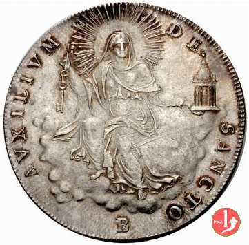 La chiesa con testa radiata, seduta su nubi tiene in mano le chiavi; alla sua sinistra tempietto.