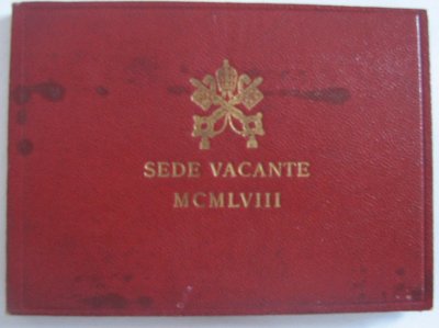 SEDE VACANTE MCMLVIII.Stemma del Camerlengo Aloisi Masella. VENI SANCTE SPIRITUS.Colomba radiante in volo. Al di sotto STATO DELLA CITTA' DEL VATICANO e nominale