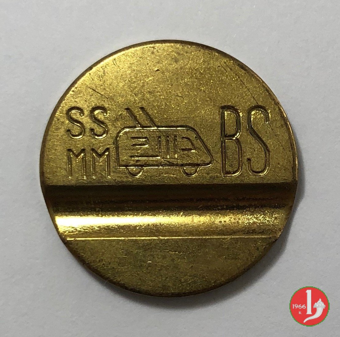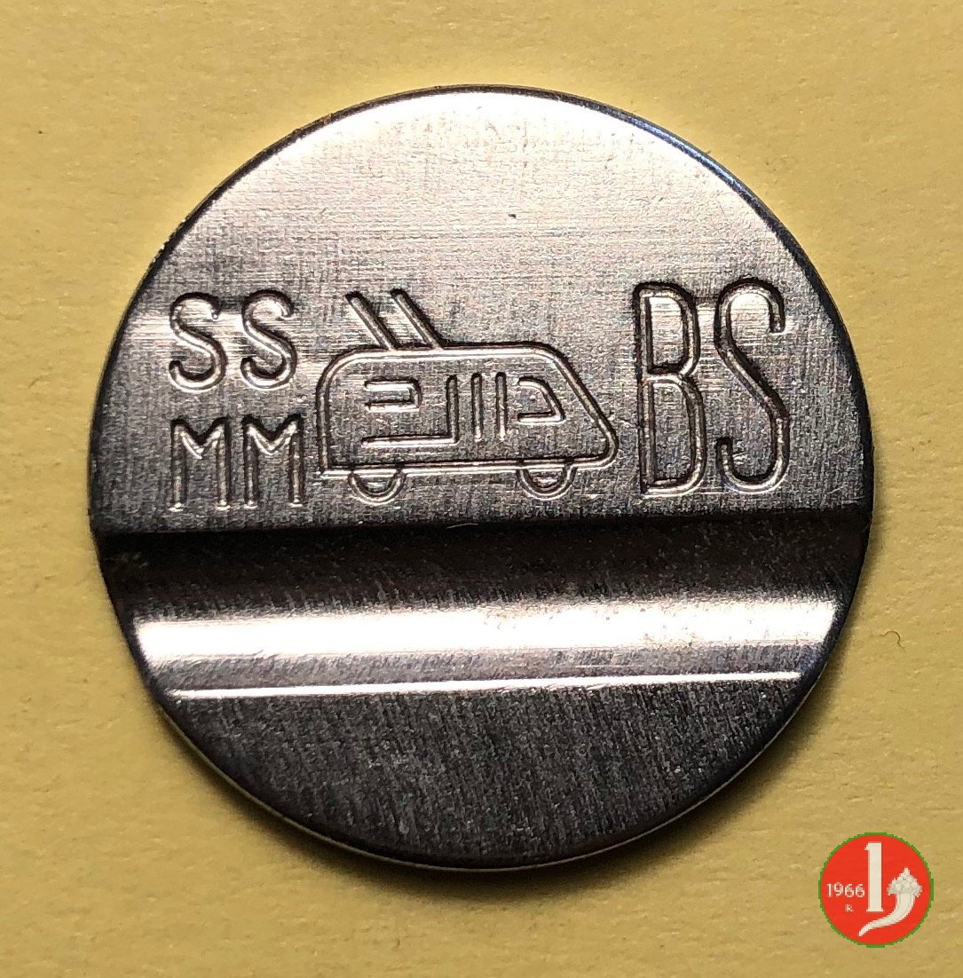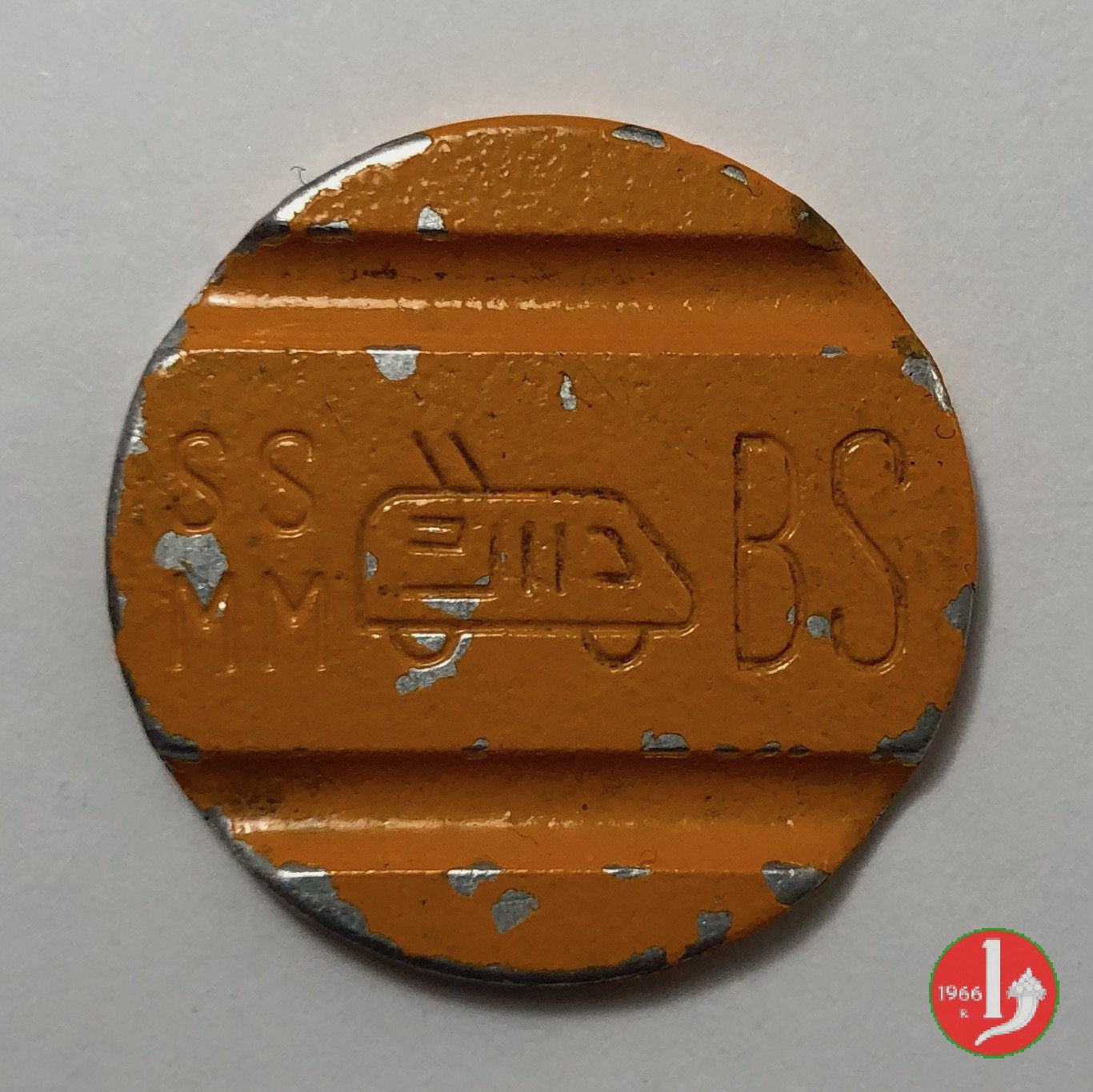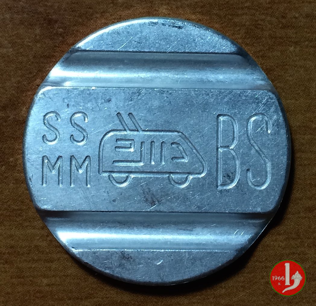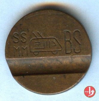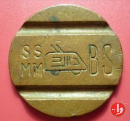Scritta in incuso du due righe GETTONE AUTOFILOVIARIO con al centro due scanalature ravvicinate. al centro da sinistra sigla SS MM su due righe, al centro filobus stilizzato e a destra sigla BS