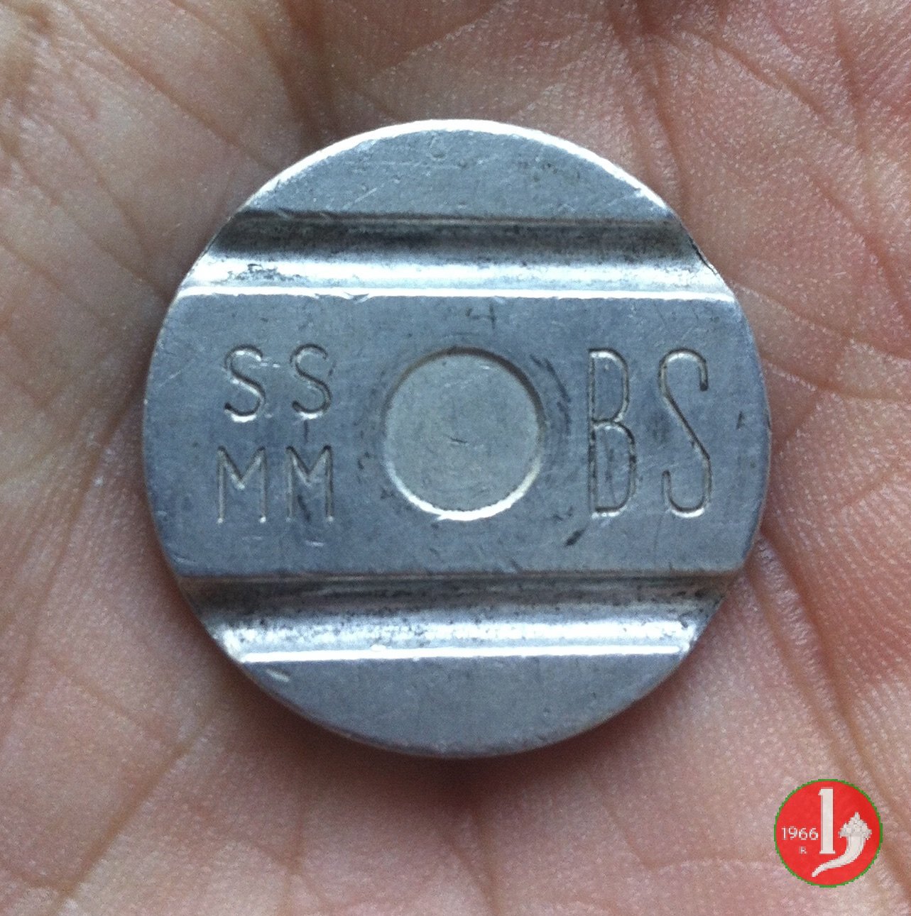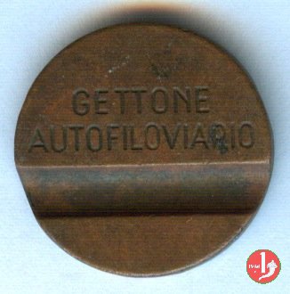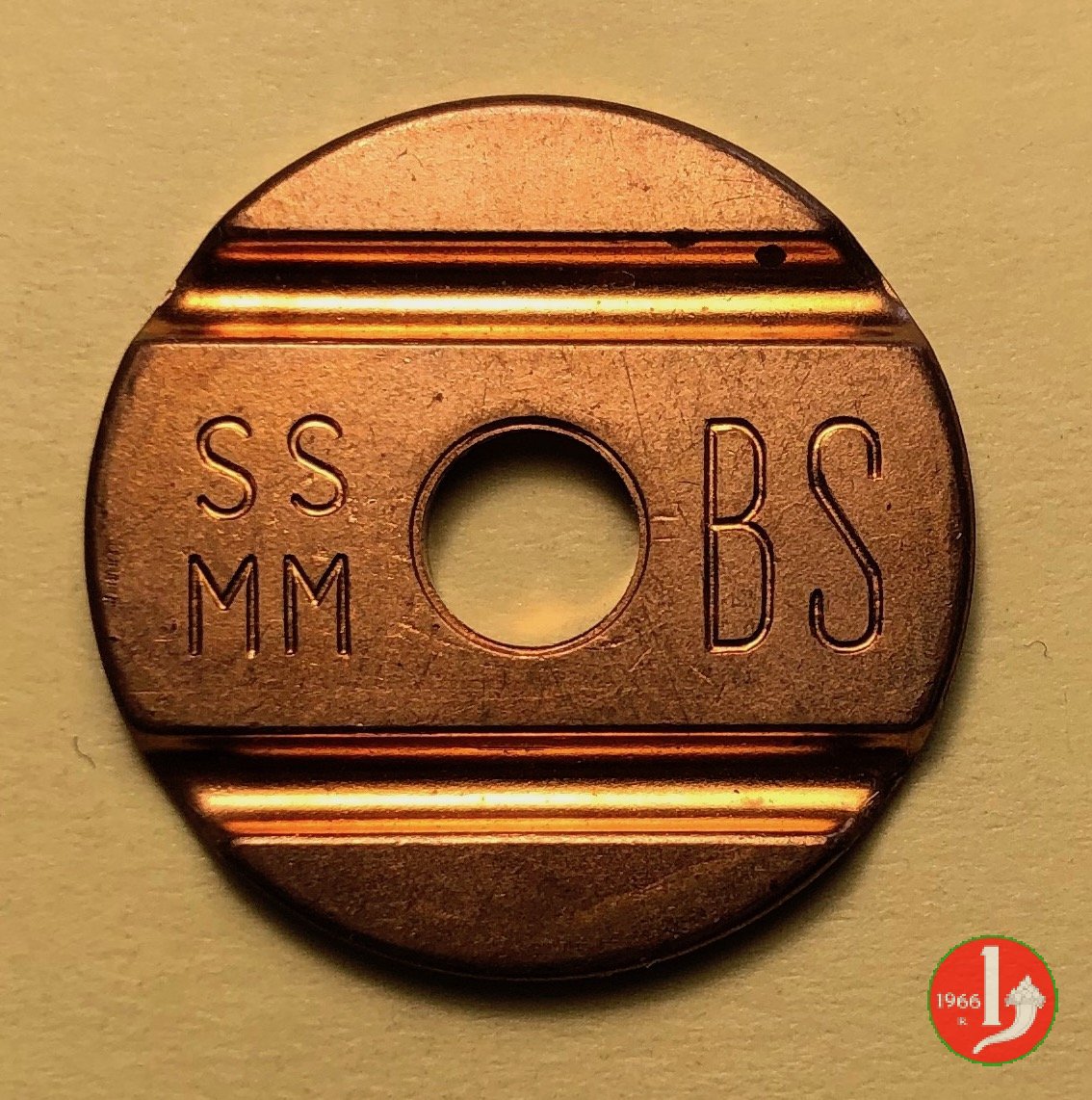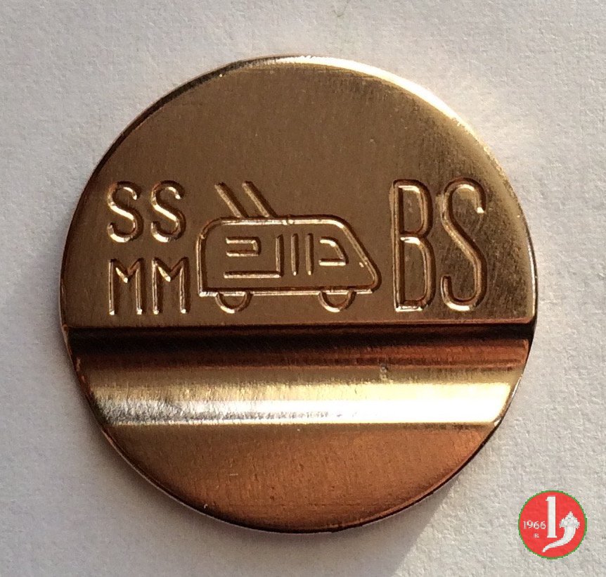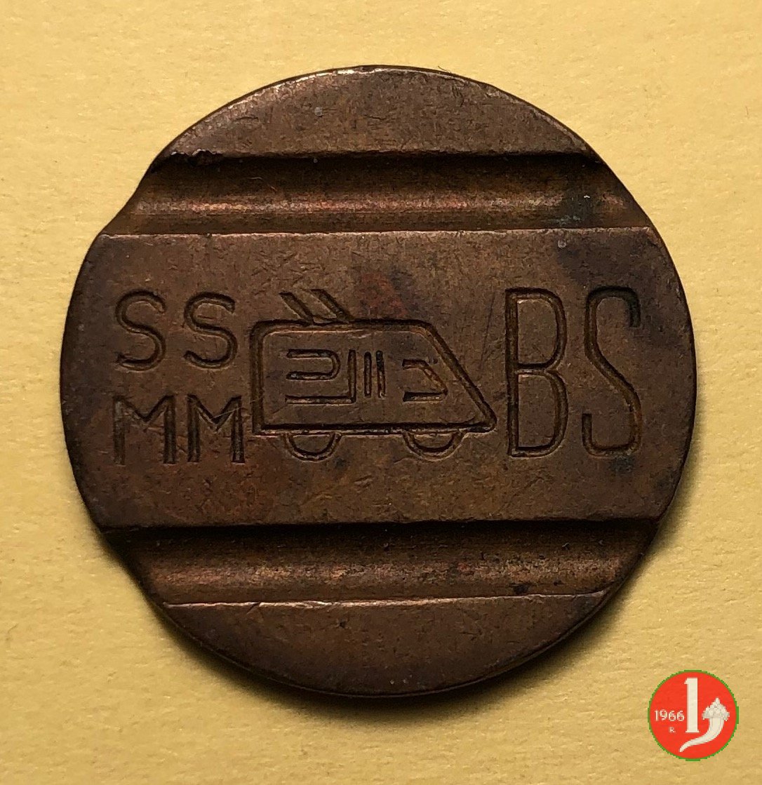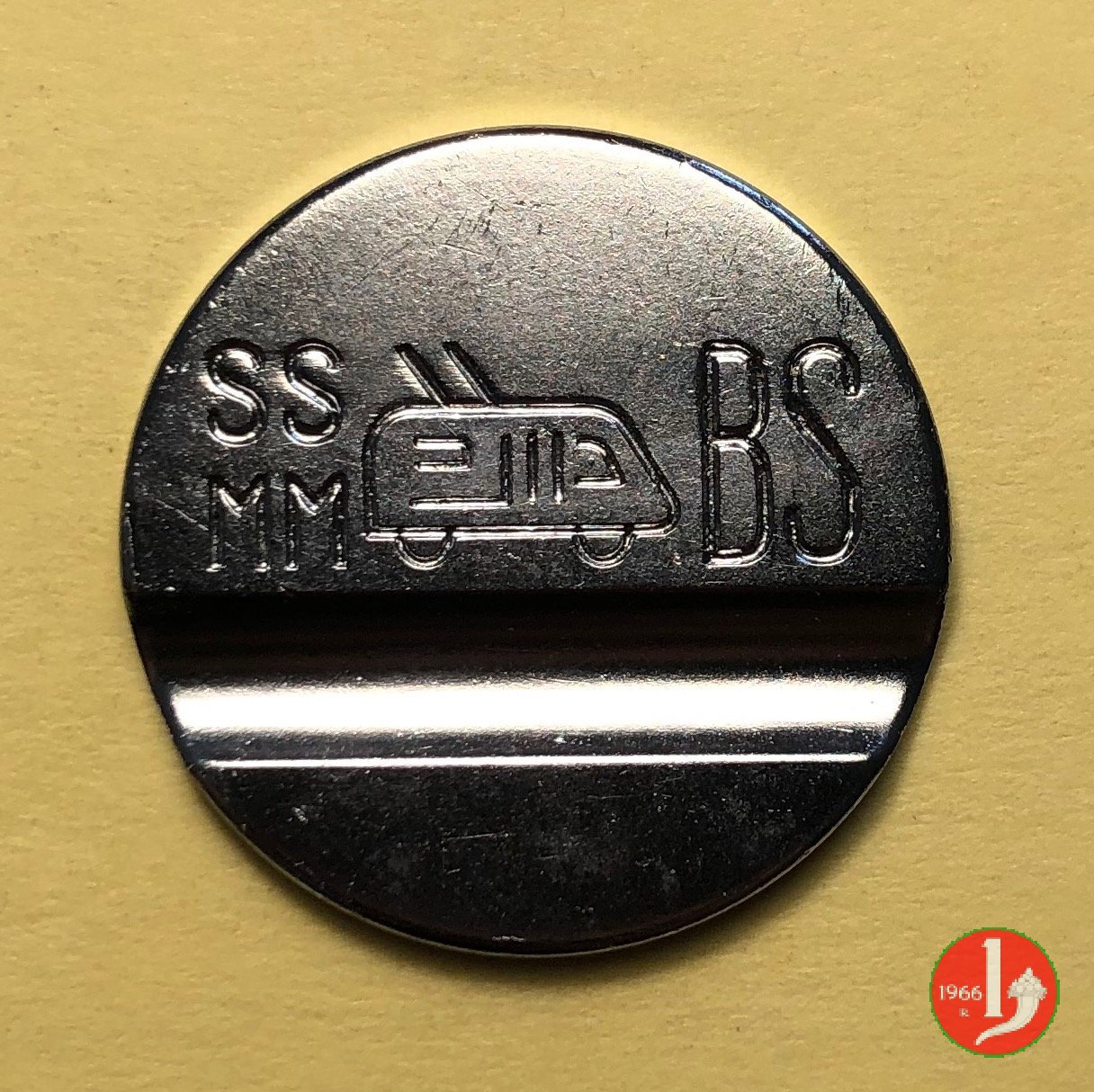 Scritta in incuso du due righe GETTONE AUTOFILOVIARIO con al centro due scanalature ravvicinate. al centro da sinistra sigla SS MM su due righe, al centro filobus stilizzato e a destra sigla BS