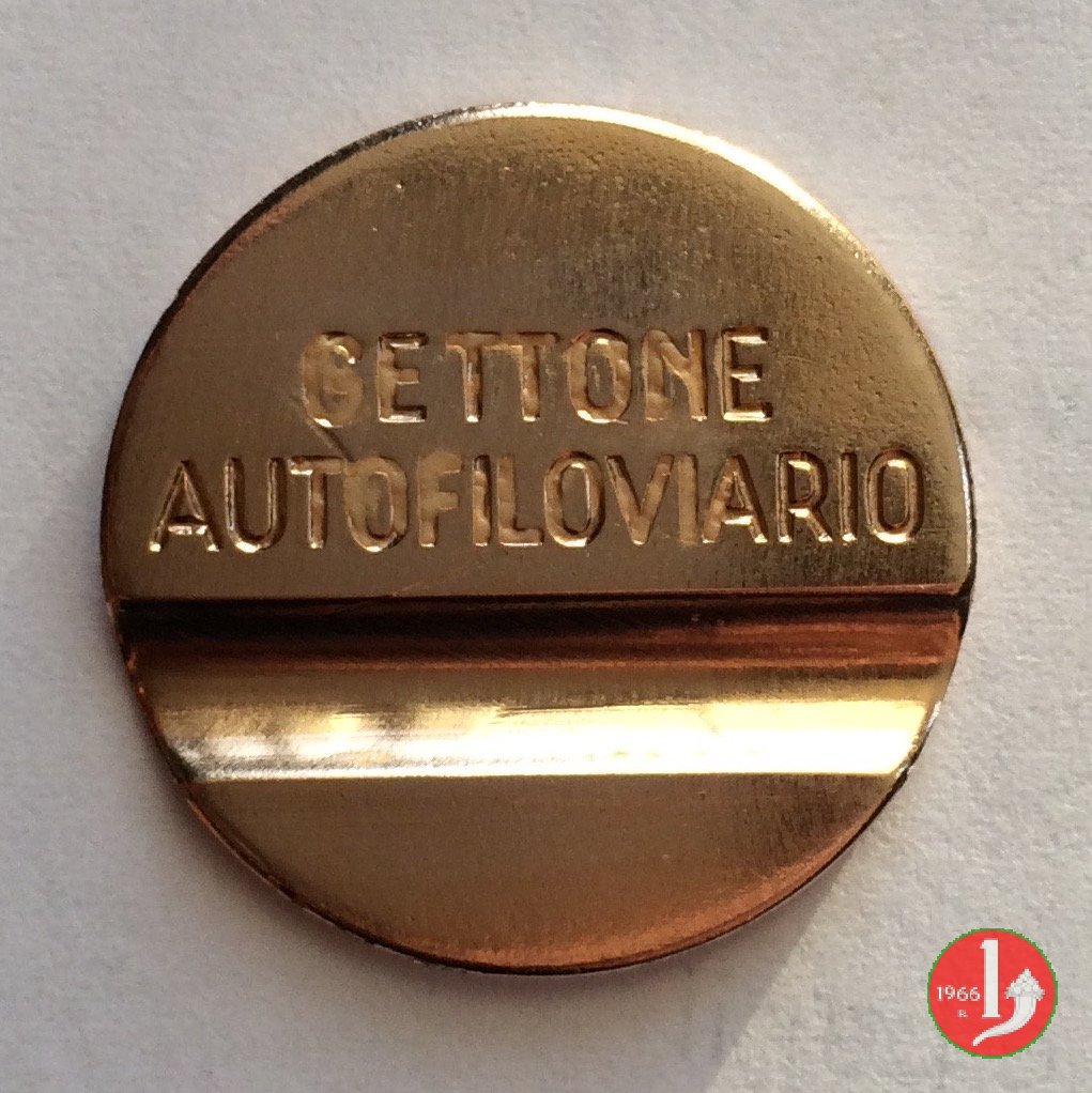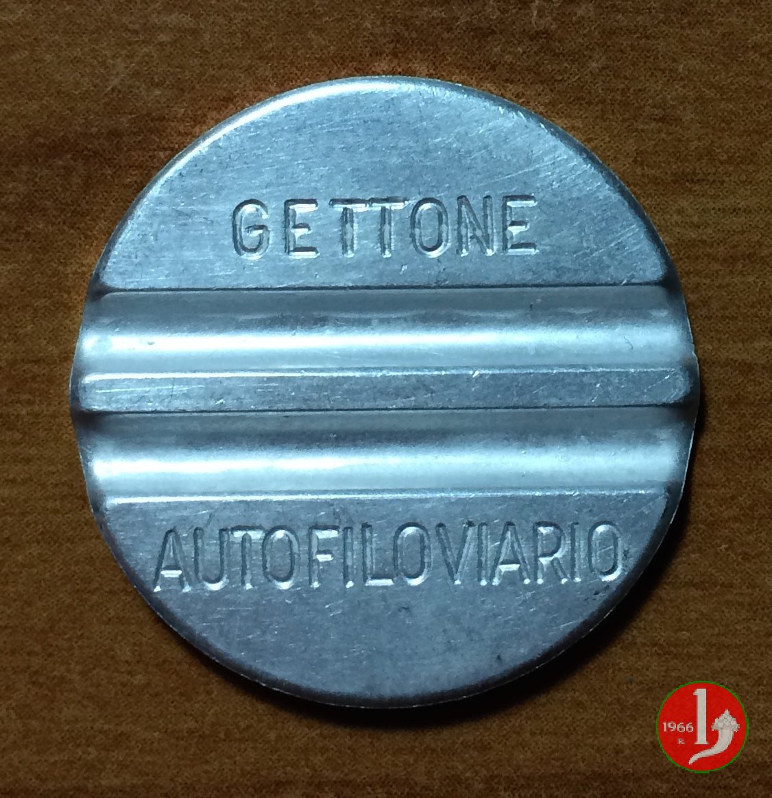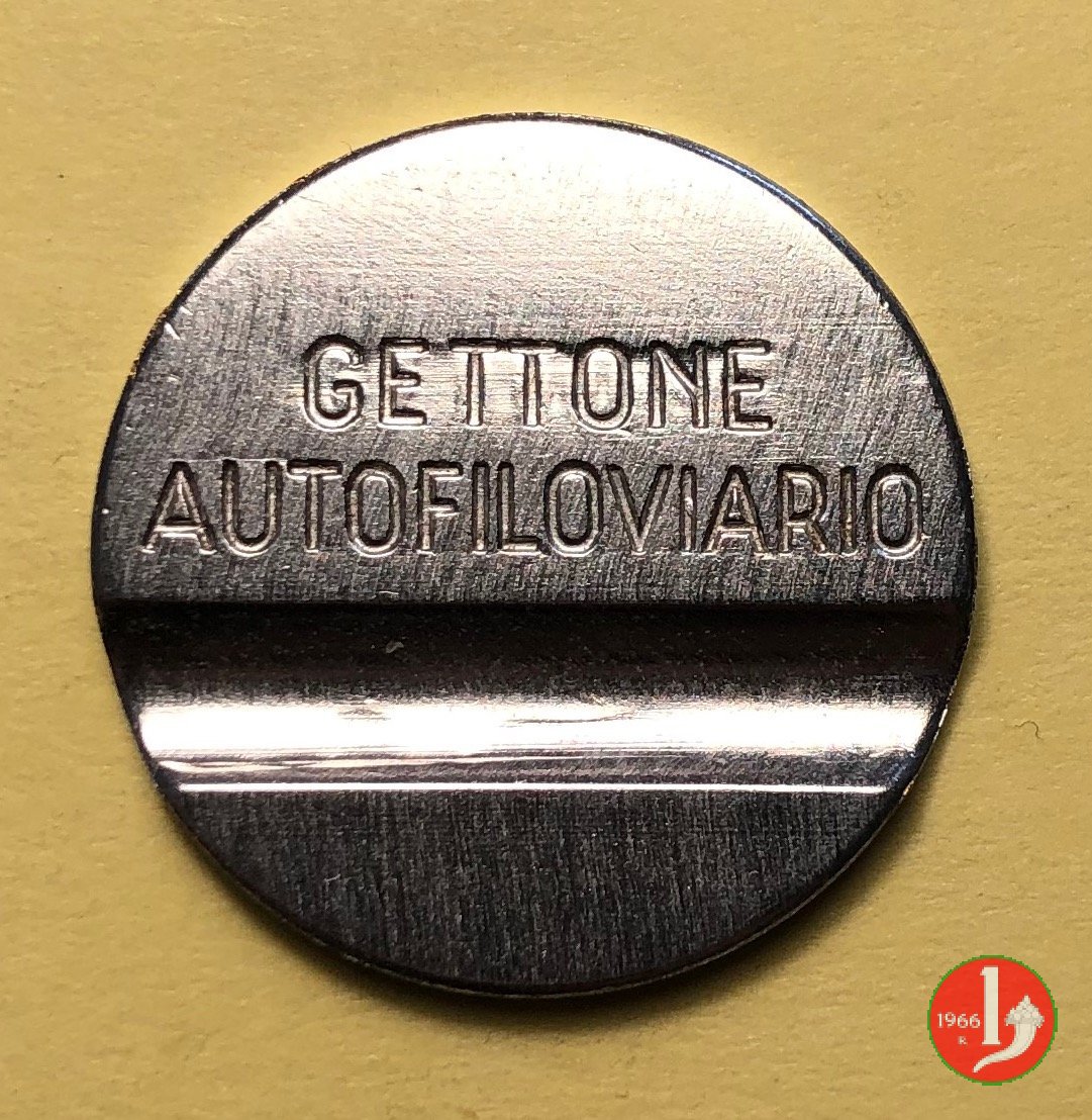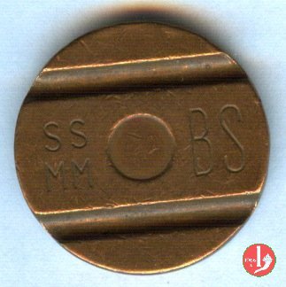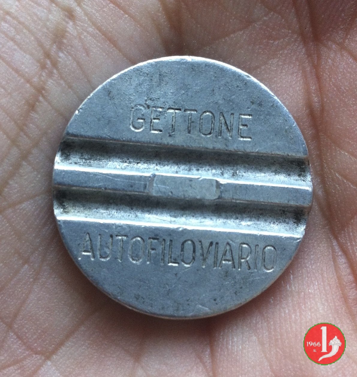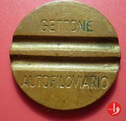 Scritta in incuso du due righe GETTONE AUTOFILOVIARIO con al centro due scanalature ravvicinate. al centro da sinistra sigla SS MM su due righe, al centro filobus stilizzato e a destra sigla BS