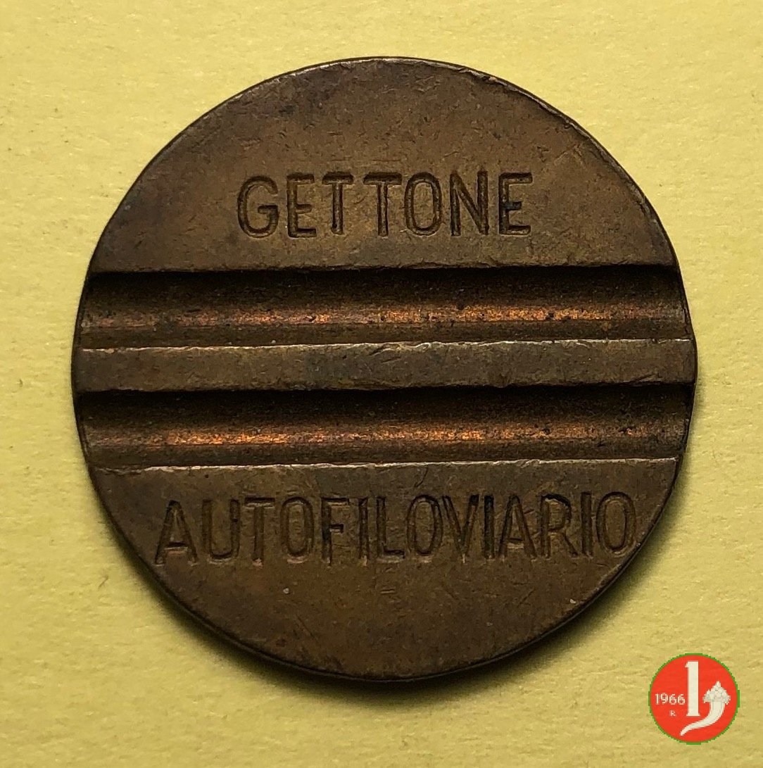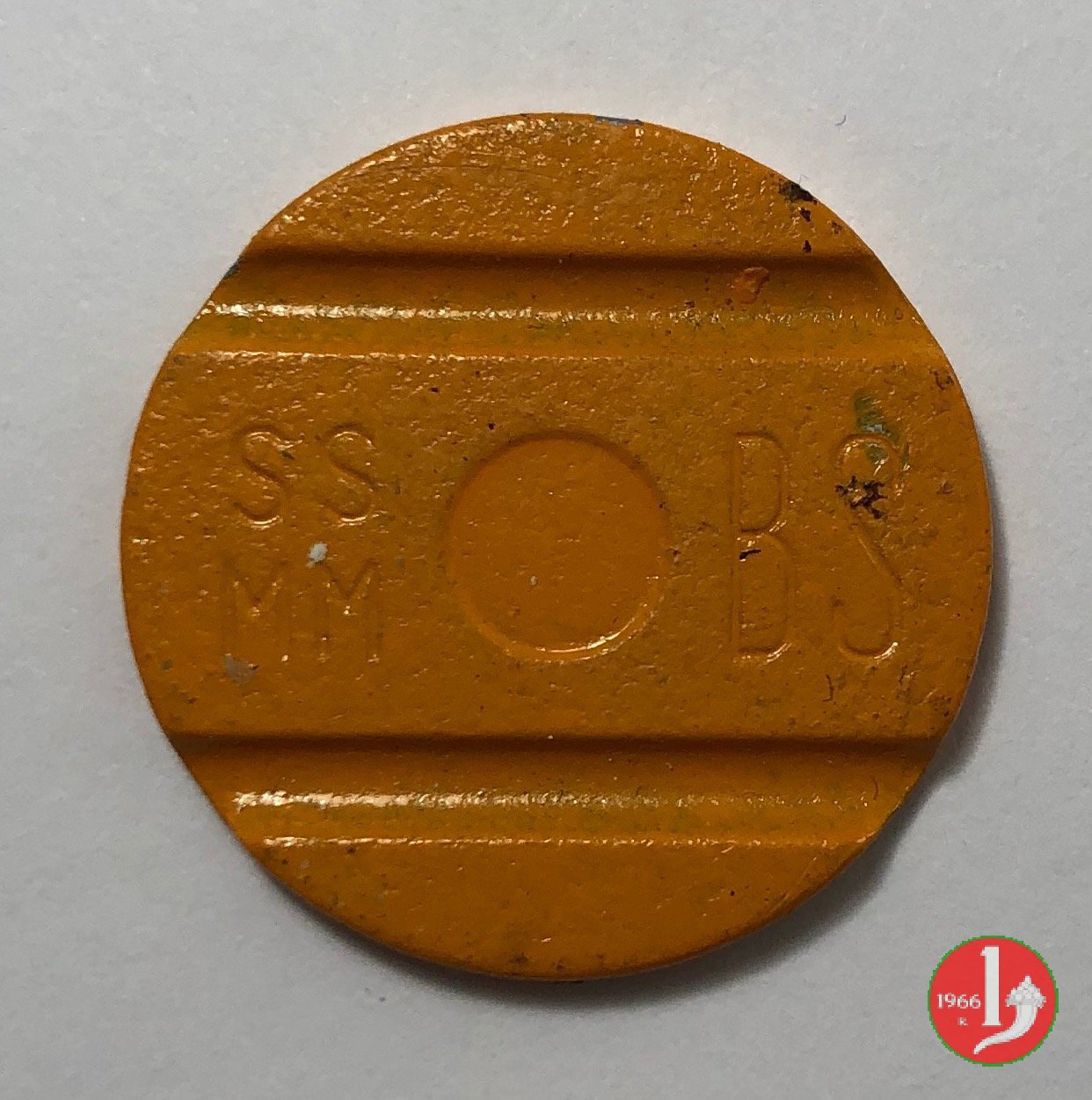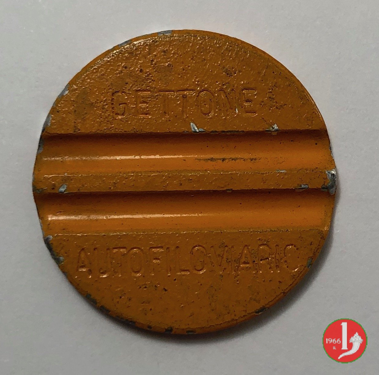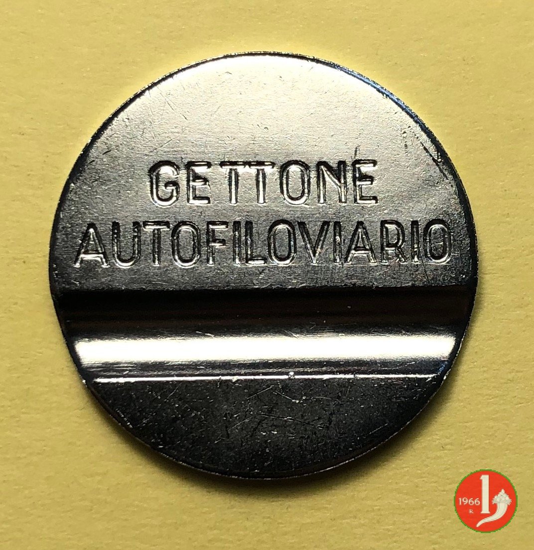 Scritta in incuso du due righe GETTONE AUTOFILOVIARIO con al centro due scanalature ravvicinate. al centro da sinistra sigla SS MM su due righe, al centro filobus stilizzato e a destra sigla BS