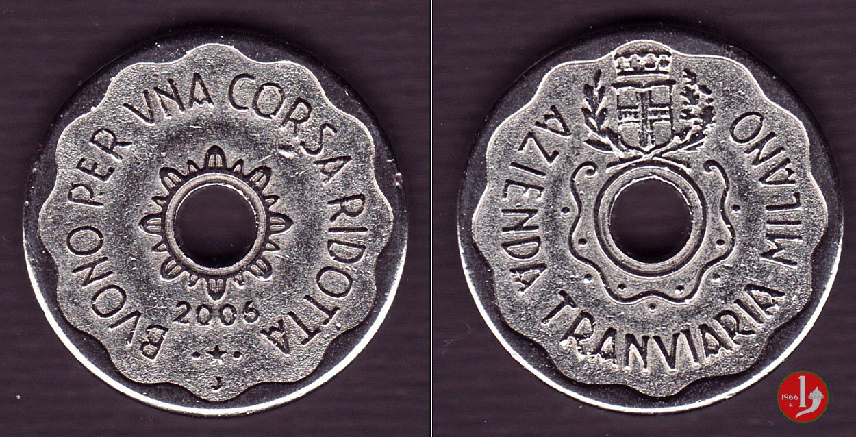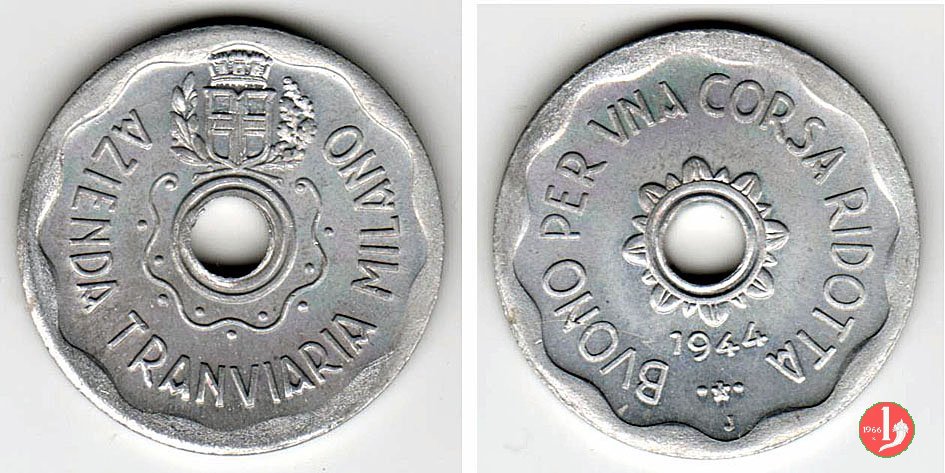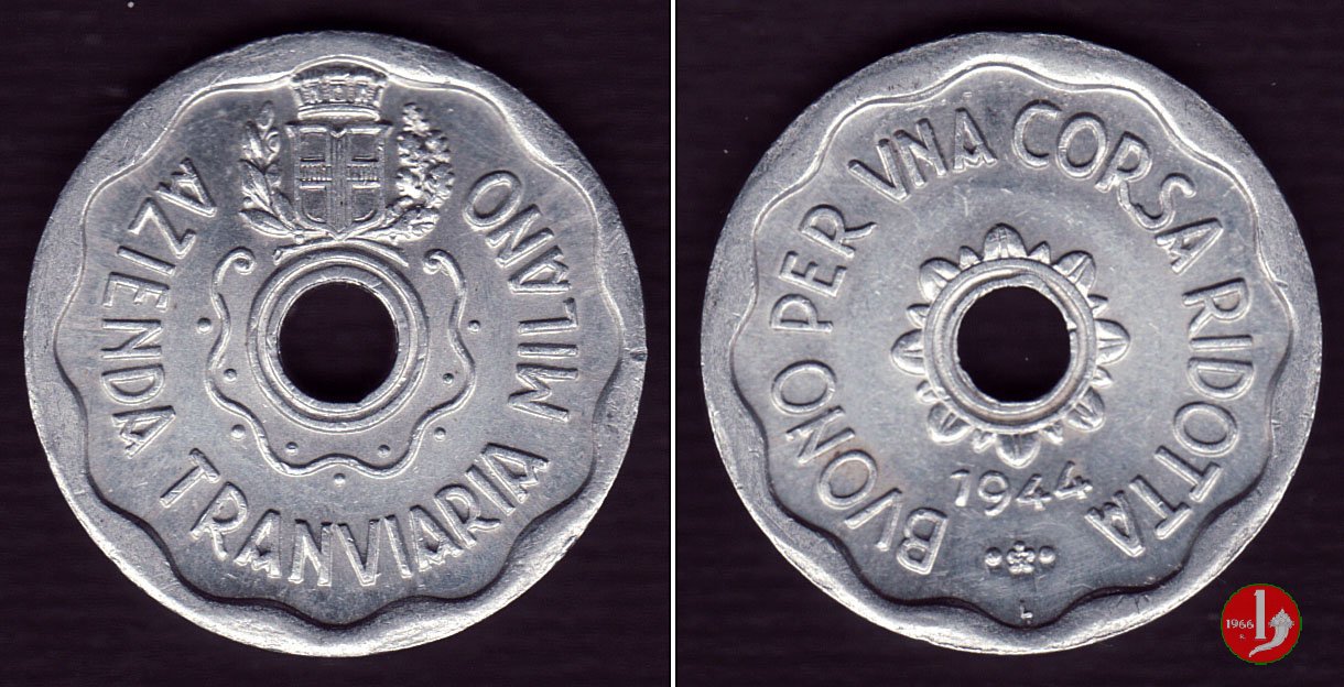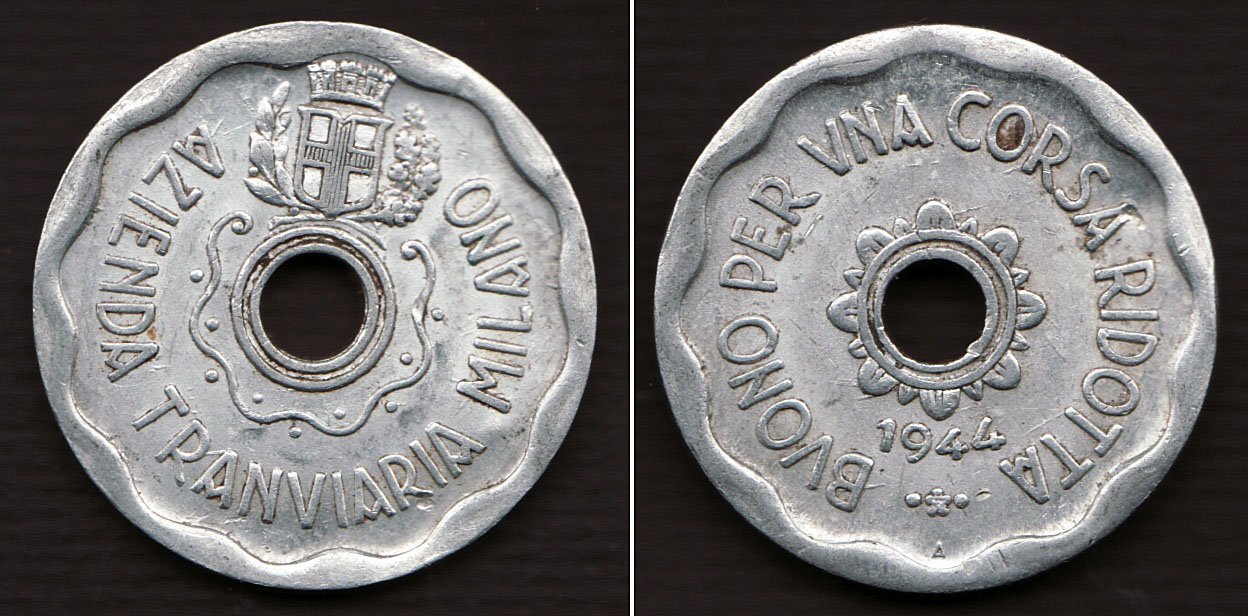 | Coniati allo scopo di ri-finanziare le casse dell' Azienda Tramviaria Milanese per la ricostruzione dei depositi e dei mezzi andati distrutti dai bombardamenti della 2a guerra mondiale, venivano dati in resto ai passeggeri e, cumulandoli, davano diritto ad una corsa per una tratta ridotta. Il foro centrale consentiva di accatastarli e stoccarli su appositi paletti in legno vicino al posto di guida. Nell' anno 2006, per celebrare il 75° della fondazione, ATM ordinò il riconio di questi gettoni (Cupronichelio, anno 2006, lettera J). | ||||