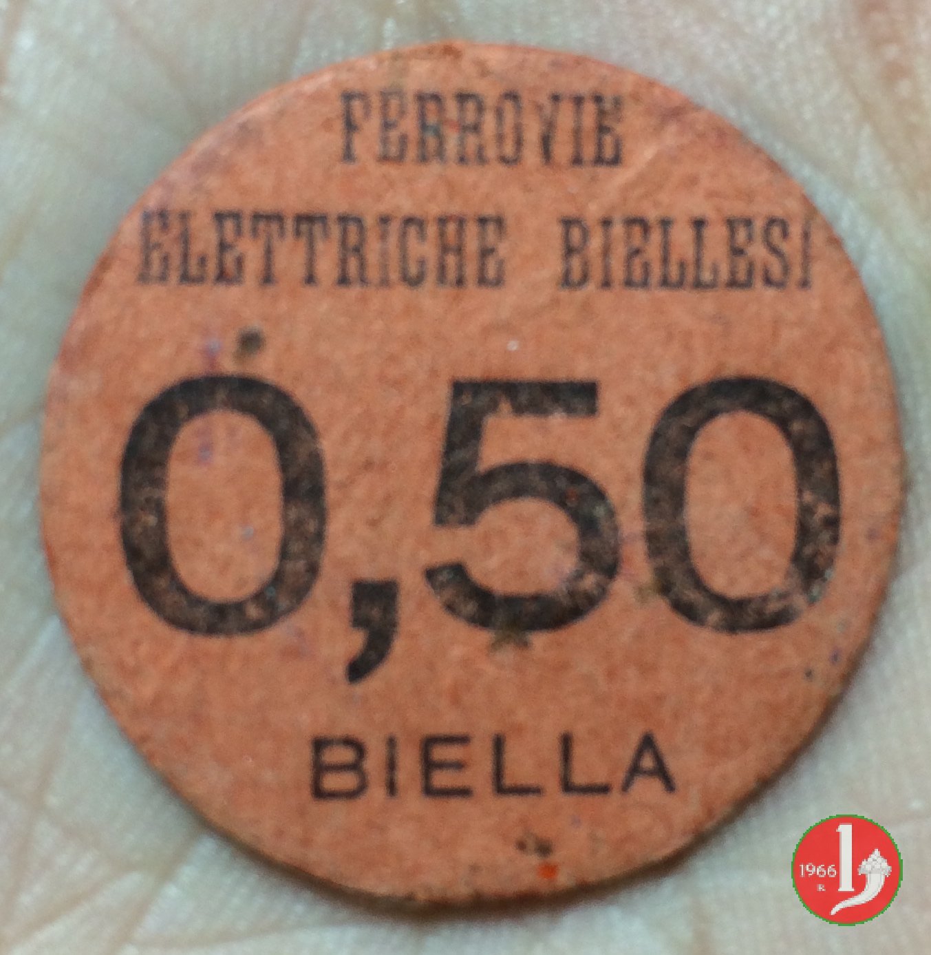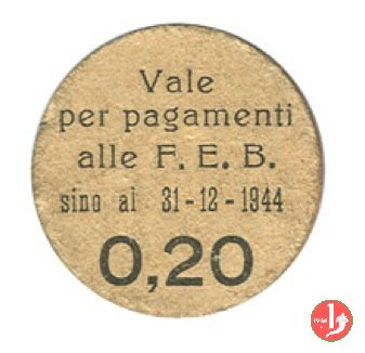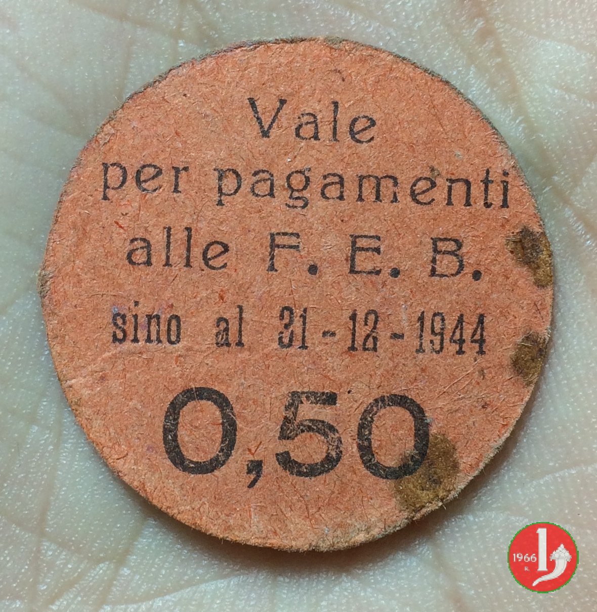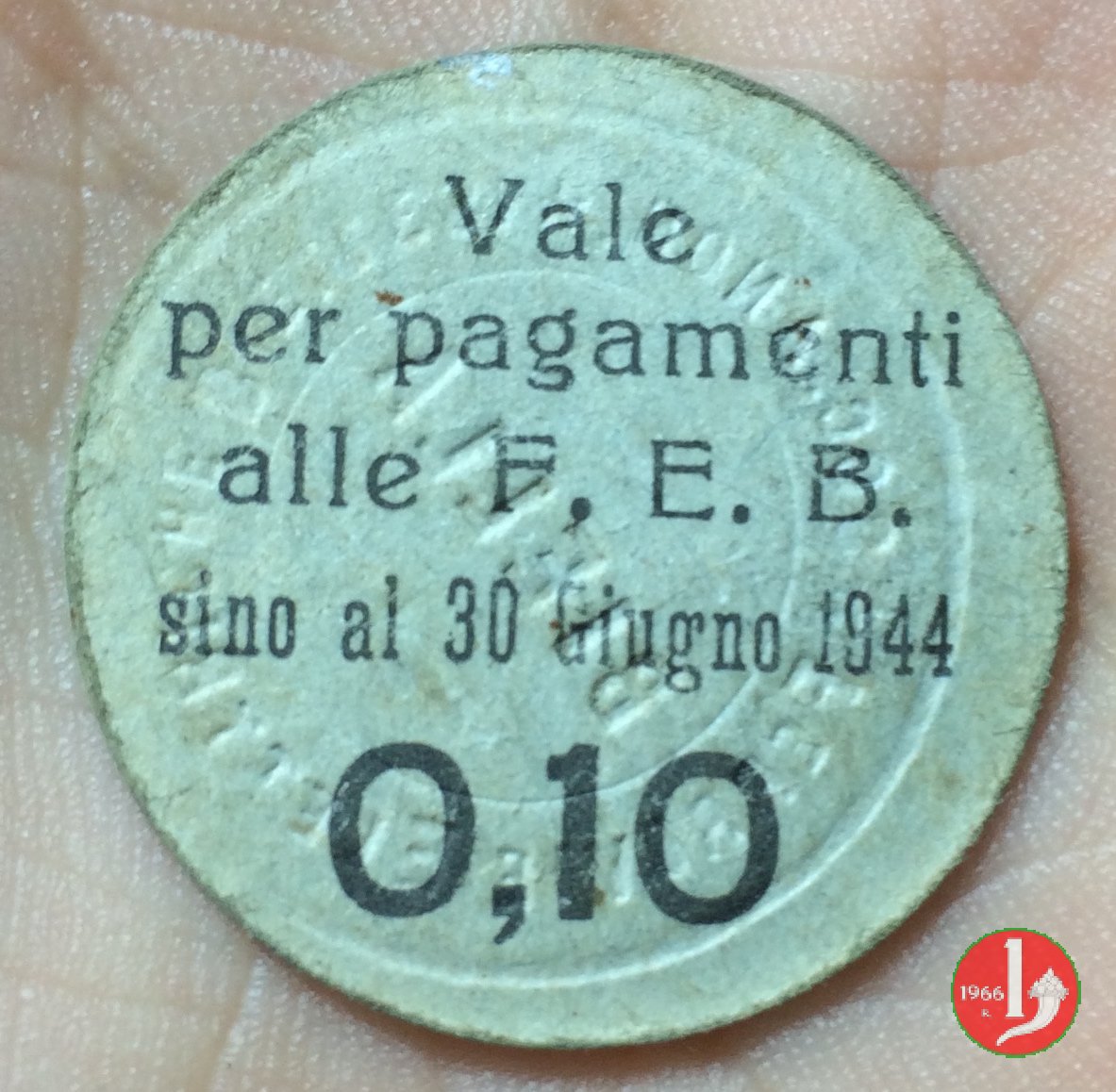 Ferrovie Elettriche Biellesi con valore. Scritta "Vale per pagamenti alle F.E.B. sino al 31-12-1944" e valore.