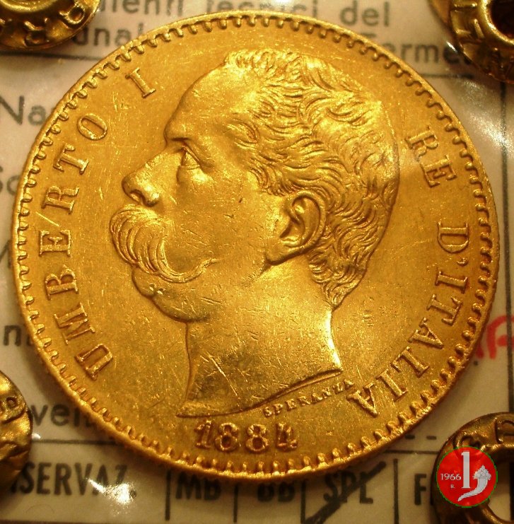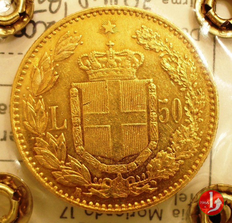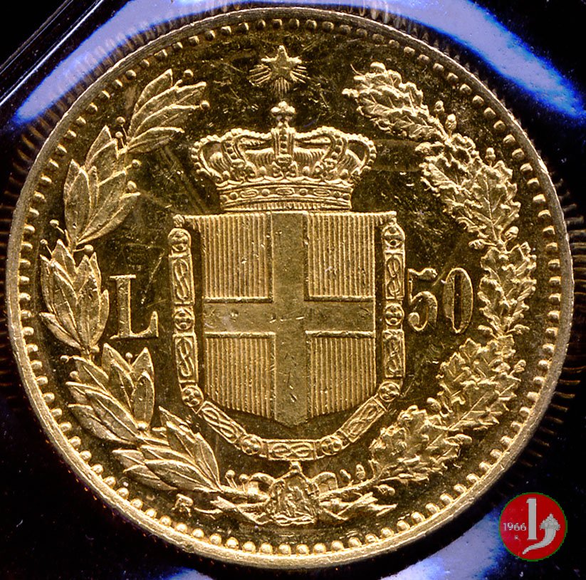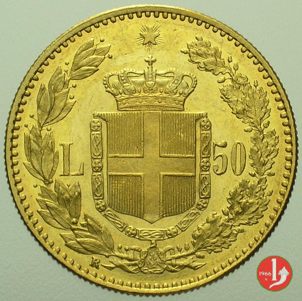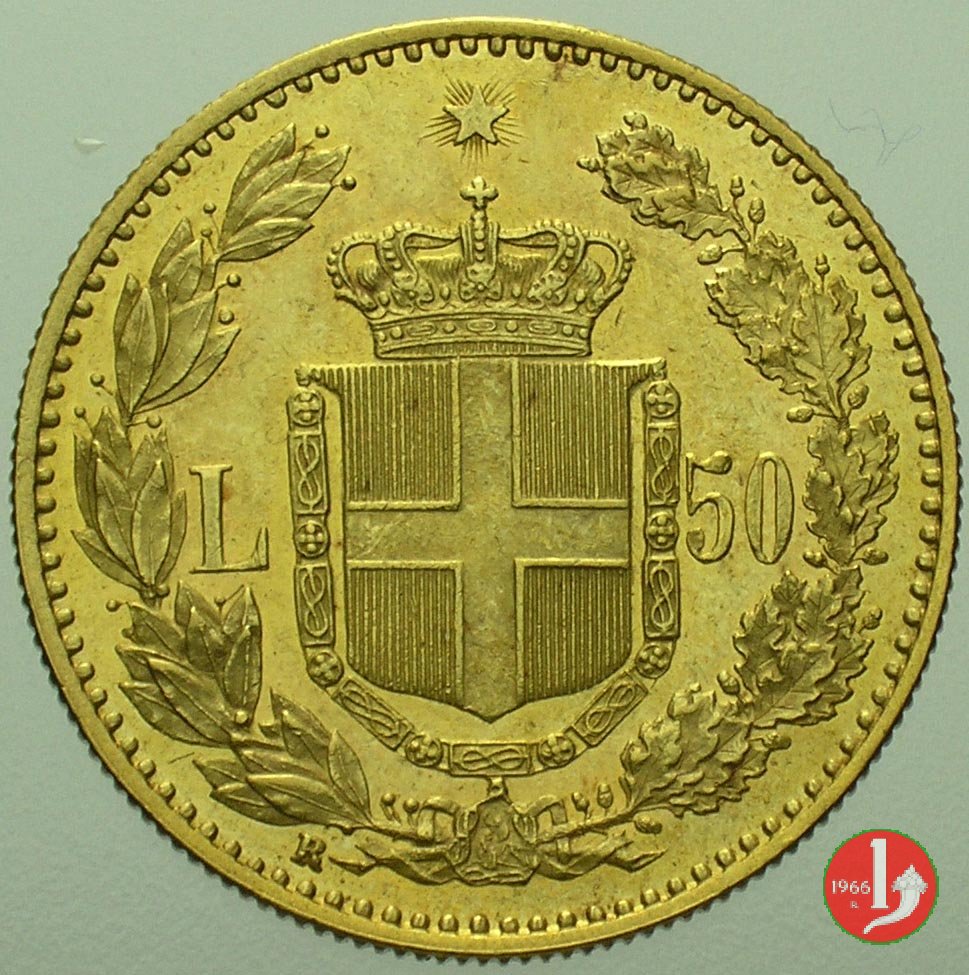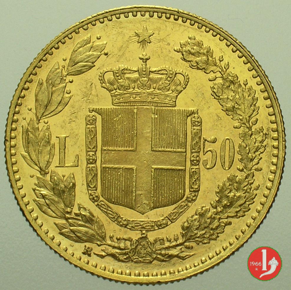 Volto del Re a sinistra, intorno UMBERTO I RE D'ITALIA. In basso il millesimo. Lungo la base del collo indicazione dell'autore (SPERANZA). Stemma Sabaudo contornato dal collare dell'Annunziata tra un ramo di quercia (a destra) e un ramo di alloro (a sinistra) e il valore (L. 50). In basso a ore 7 il segno di zecca (R), in alto in posizione centrale la Stella d'Italia.