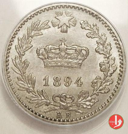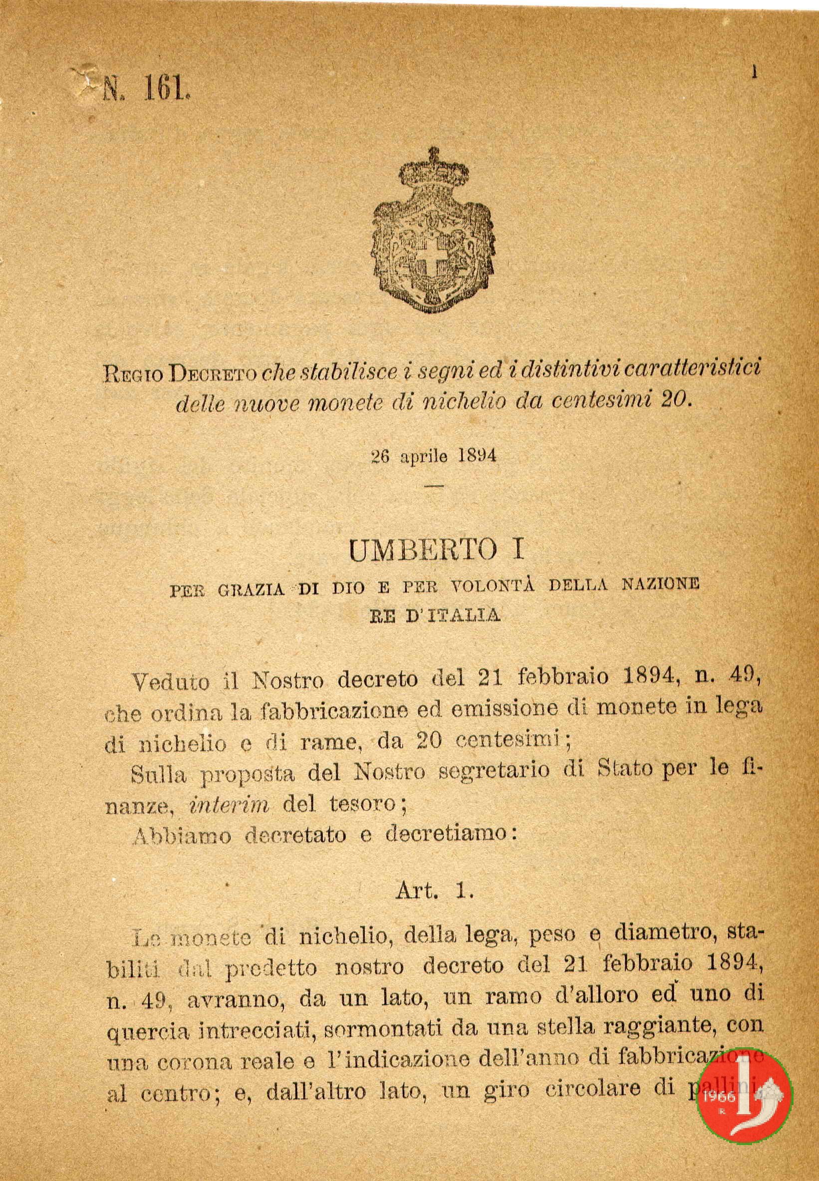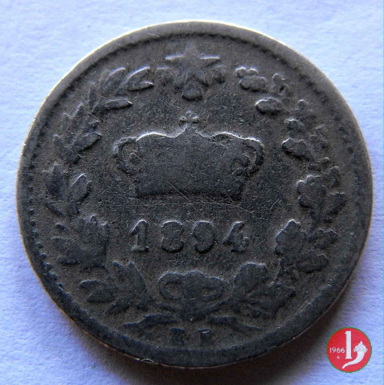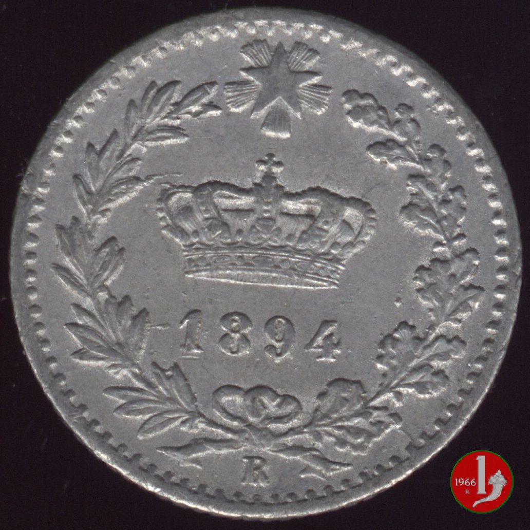 di nichelino. Emessa con Regio Decreto n. 49 del 21 febbraio 1894 che autorizza lemissione dei buoni di cassa da lire due, del valore nominale di sessanta milioni di lire, e la fabbricazione e lemissione di monete di bronzo in lega di nichelio e di rame da 20 centesimi, per il valore complessivo di venti milioni di lire. Segno di zecca per Berlino: K • B Segno di zecca per Roma: R Queste monete furono ritirate a partire dal 1909 e riutilizzate in parte per il conio dei 20 centesimi esagono. Il ritiro fu in parte dovuto al fatto che questa moneta fosse molto falsificata, era in effetti la moneta di metallo non nobile di piú alto valore: Attenti ai Nichelini - Avete voi, lettore, dei nichelini in tasca?