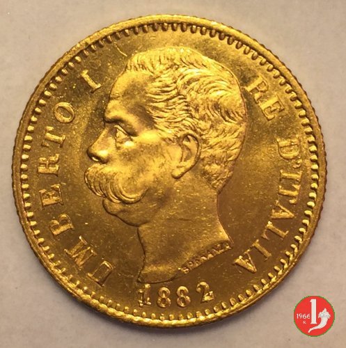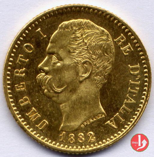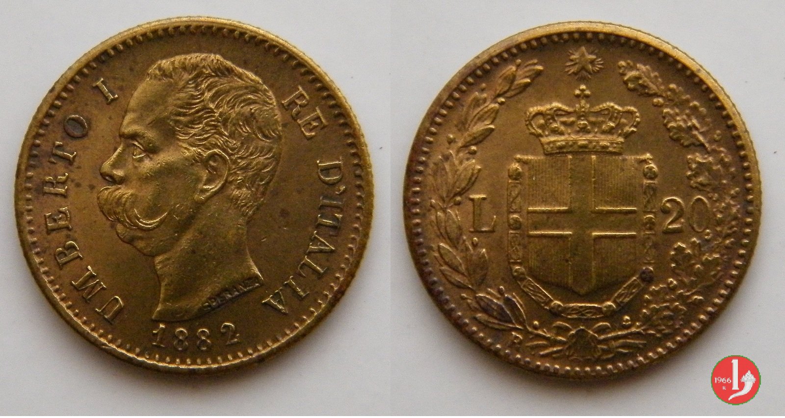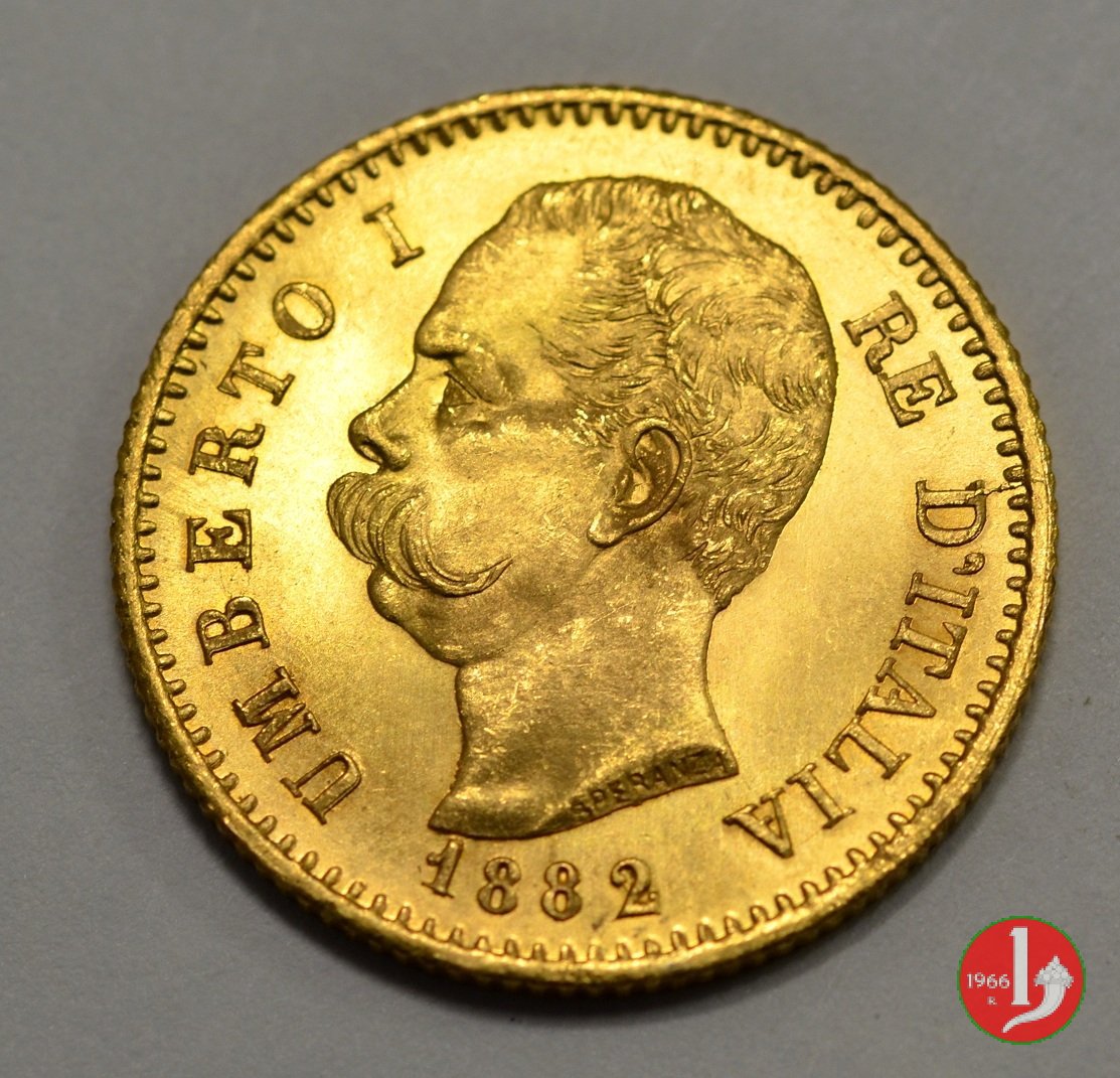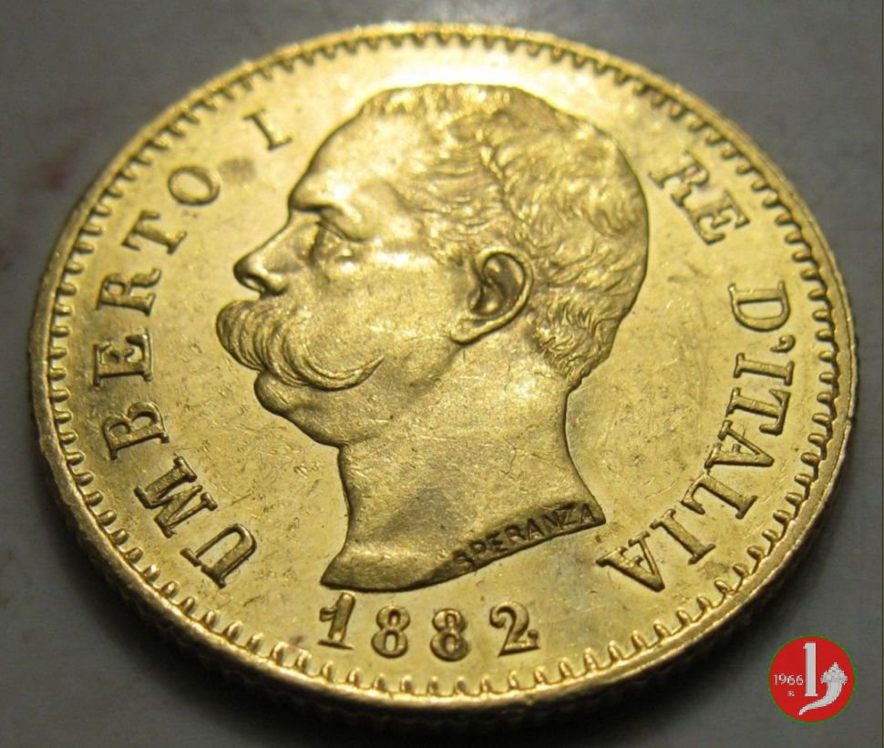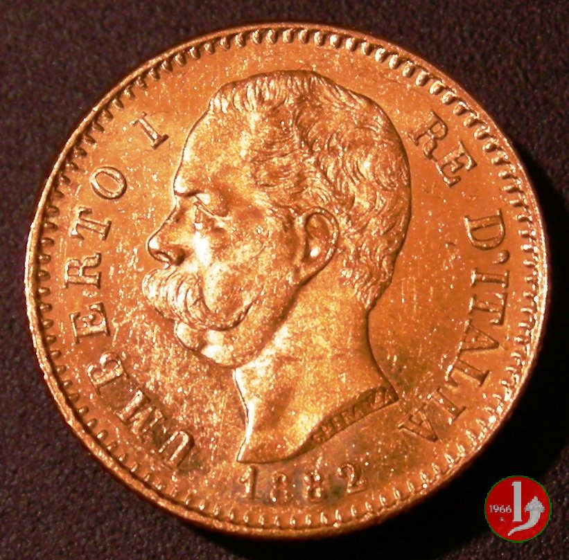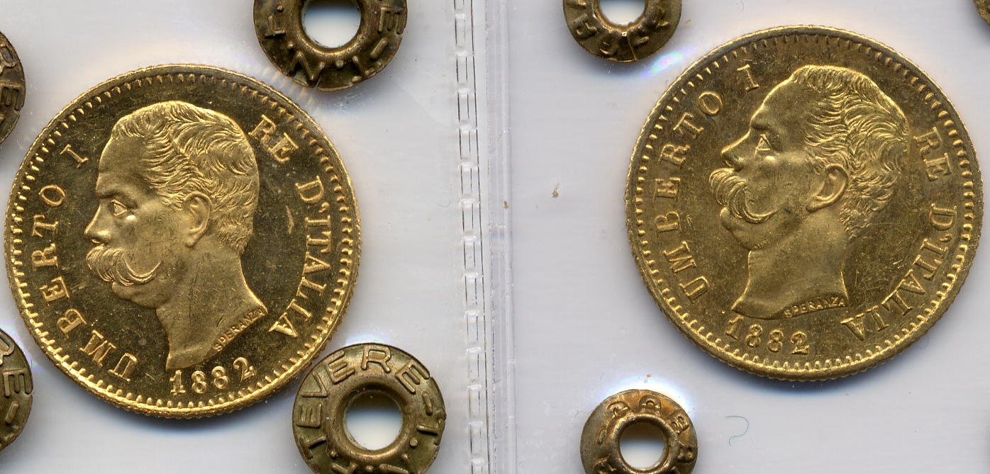 Il quantitativo di monete battuto nel 1882 è significativamente superiore a quello di tutti gli altri anni; per questo motivo altri cataloghi hanno ipotizzato, in maniera incorretta, che tali monete siano state battute anche successivamente e addirittura fino al 1915. In realta', il motivo per cui nel 1882 si batterono monete d'oro per complessive £. 139.523.000 (1.129 esemplari da 100 lire ed il resto in marenghi) è dovuto alla trasformazione di verghe d'oro e di monete auree non decimali, frutto del prestito di 644 milioni di lire richiesto ed ottenuto dal Governo Italiano all'estero, per fronteggiare la conversione in moneta metallica della carta moneta, all'indomani della Legge (7.4.1881 nr. 133) che aboliva il "corso forzoso". | |