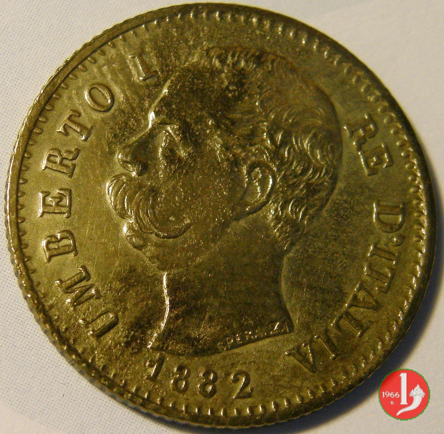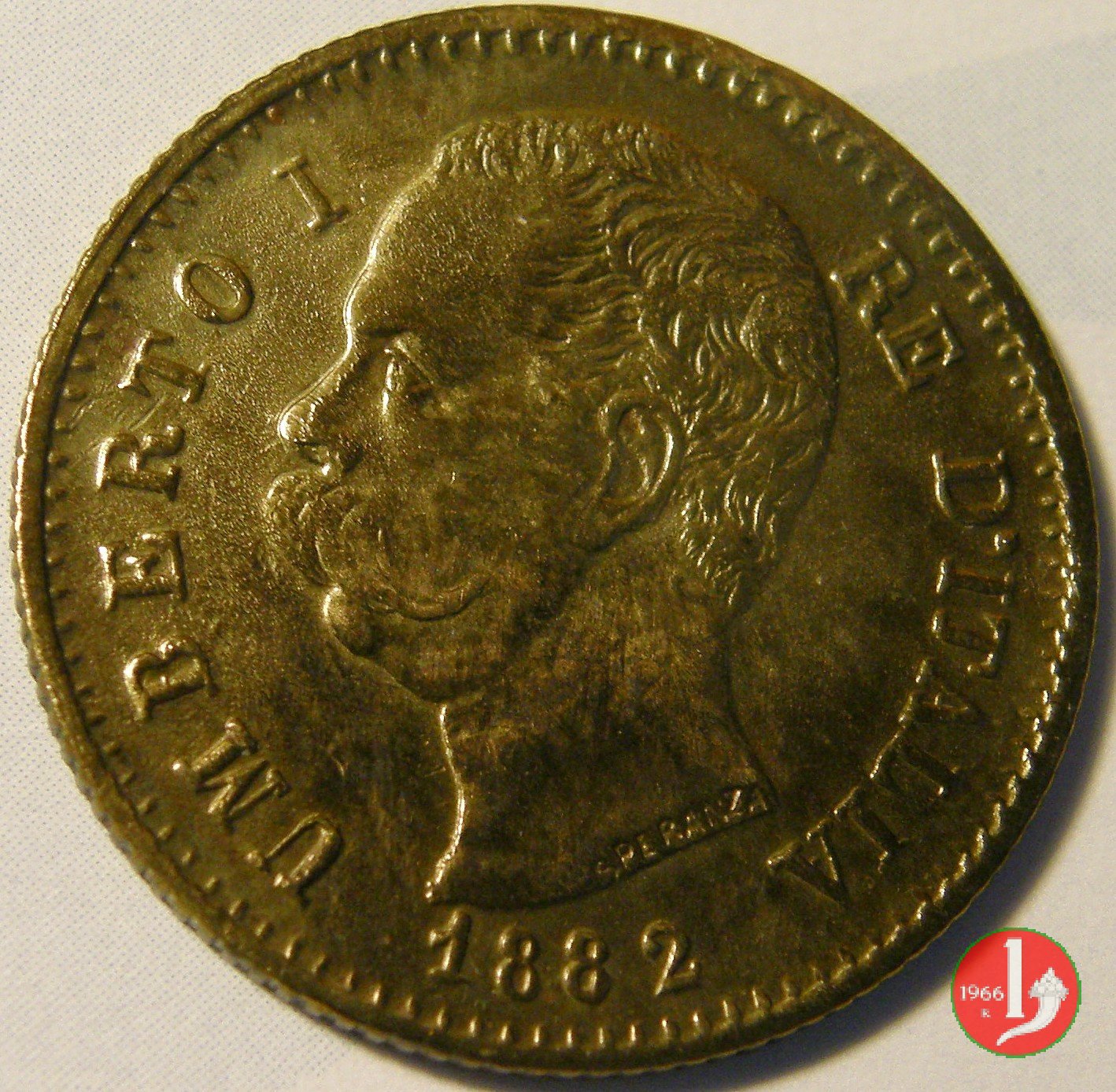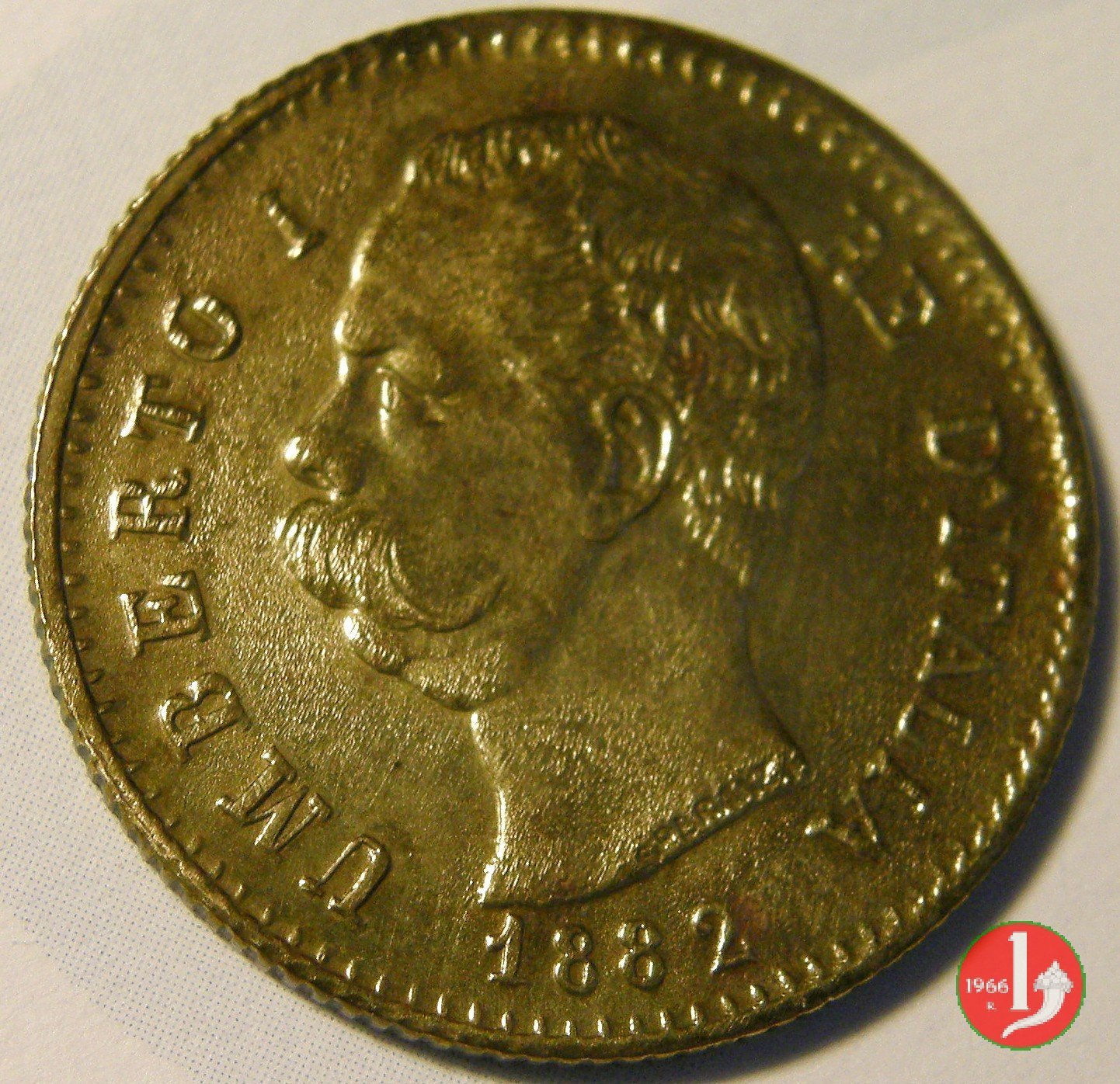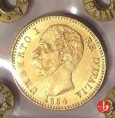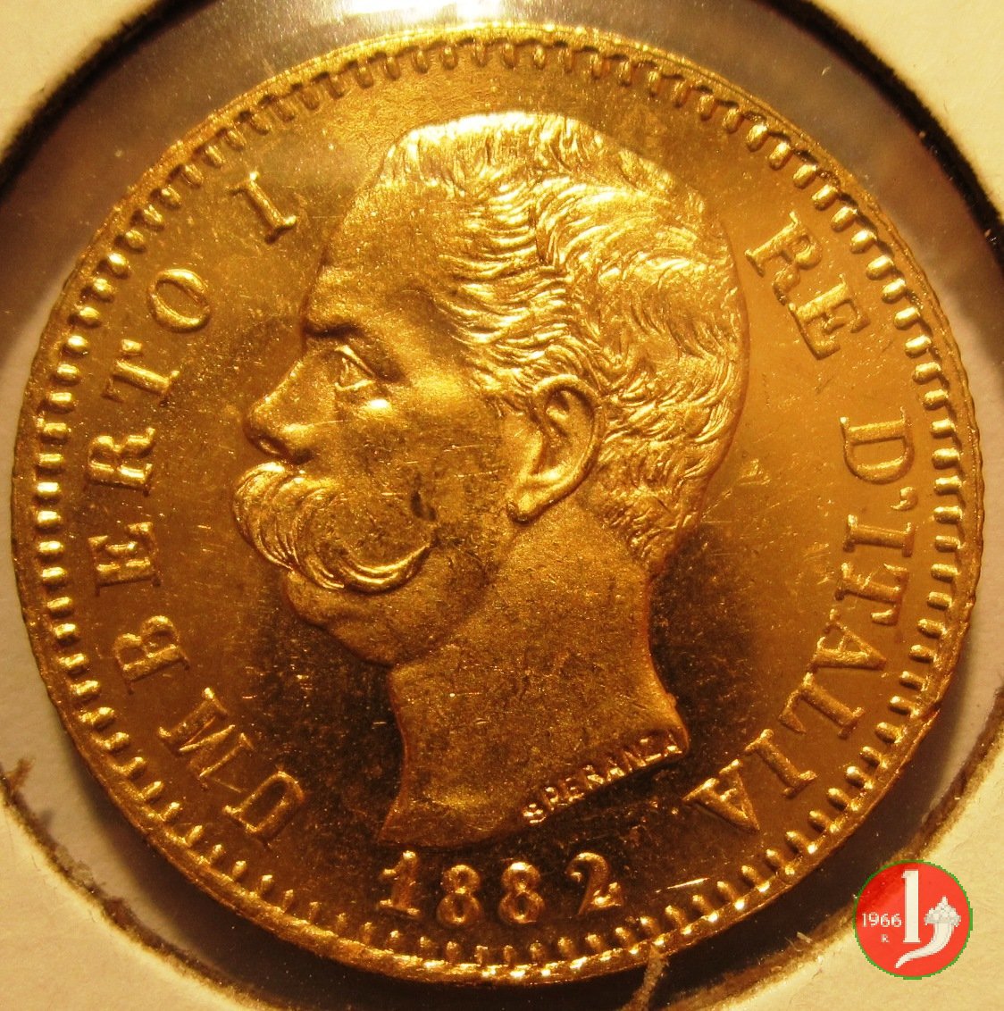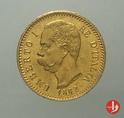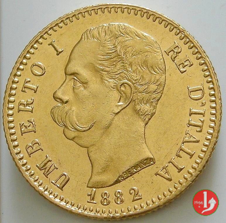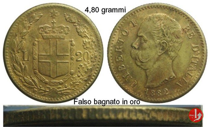 Il quantitativo di monete battuto nel 1882 è significativamente superiore a quello di tutti gli altri anni; per questo motivo altri cataloghi hanno ipotizzato, in maniera incorretta, che tali monete siano state battute anche successivamente e addirittura fino al 1915. In realta', il motivo per cui nel 1882 si batterono monete d'oro per complessive £. 139.523.000 (1.129 esemplari da 100 lire ed il resto in marenghi) è dovuto alla trasformazione di verghe d'oro e di monete auree non decimali, frutto del prestito di 644 milioni di lire richiesto ed ottenuto dal Governo Italiano all'estero, per fronteggiare la conversione in moneta metallica della carta moneta, all'indomani della Legge (7.4.1881 nr. 133) che aboliva il "corso forzoso". | |