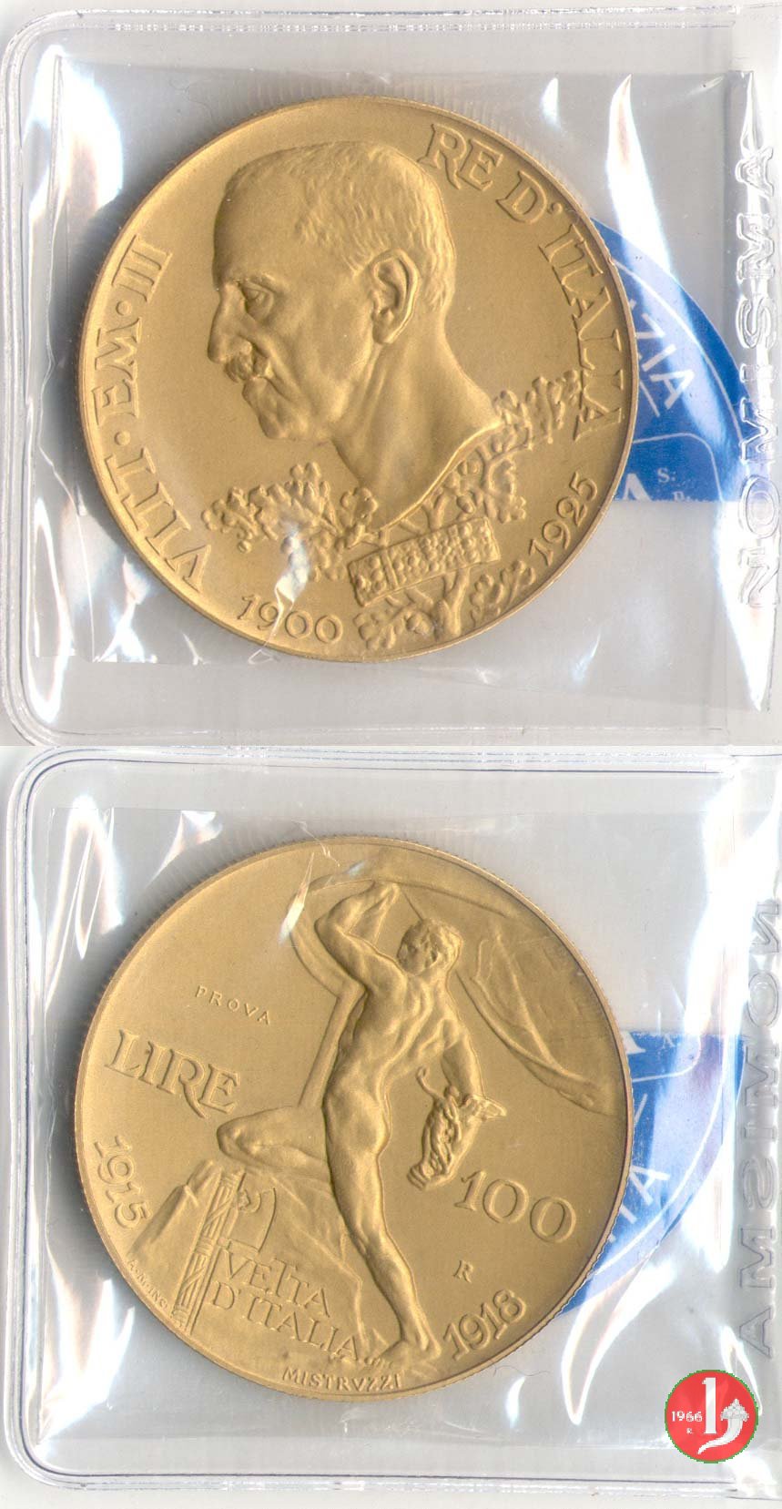 Testa nuda a sinistra. In basso corona ferrea e rami di quercia; ai lati 1900 a sinistra e 1925 a destra. Attorno VITT •EM •III RE D'ITALIA. Figura maschile che regge la bandiera del Regno inginocchiata su di una roccia che porta in incuso la scritta VETTA D'ITALIA su due righe e il fascio littorio con la scure rivolta verso destra. Ai lati della figura maschile in orizzontale indicazione del valore (LIRE 100), ai lati della roccia lungo il bordo le date 1915 e 1918. A destra verso il basso, il segno di zecca (R). Lungo il bordo indicazione dell'autore (MISTRUZZI). Nel campo a sinistra PROVA.