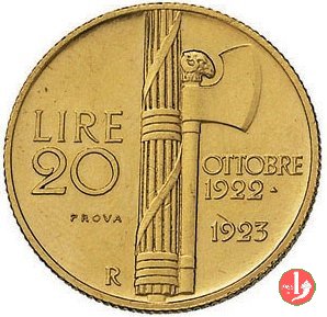 Testa nuda del Re volta a sinistra. Indicazione dell'autore (A. MOTTI) sotto il collo del Re. Attorno VITTORIO EMANUELE III RE D'ITALIA Fascio littorio con la scure a destra. Nel campo a sinistra, su due righe LIRE 20, e il mdz in basso; a destra su tre righe OTTOBRE 1922 1923. Nel campo a sinistra, scritto orizzontalmente PROVA.