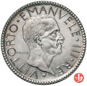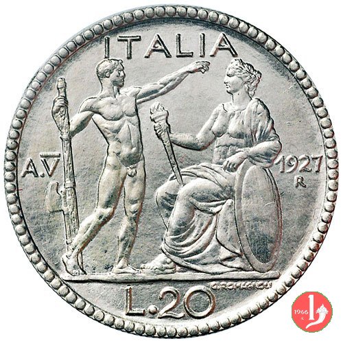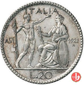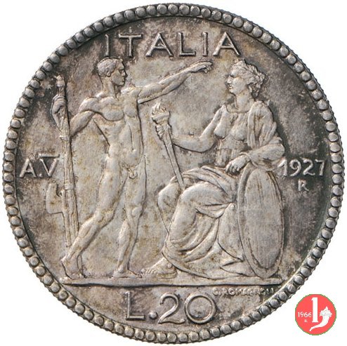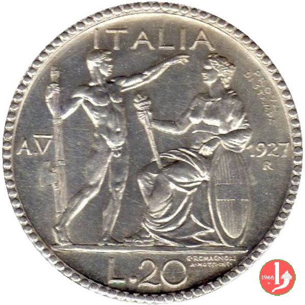 Littore con fascio che saluta romanamente una figura femminile (allegoria dell'Italia) seduta che reca una fiaccola con la mano destra e appoggia la sinistra ad uno scudo con lo stemma Sabaudo. In esergo l'indicazione del valore (L. 20) e a destra su due righe il nome dell'autore (G. ROMAGNOLI) e dell'incisore (A. MOTTI INC.). A destra della figura femminile su due righe l'anno e il segno di zecca (R); in corrispondenza a sinistra l'anno dell'Era Fascista. In alto la scritta ITALIA. Nel campo, a sinistra e in basso, circolarmente la dicitura "PROVA".