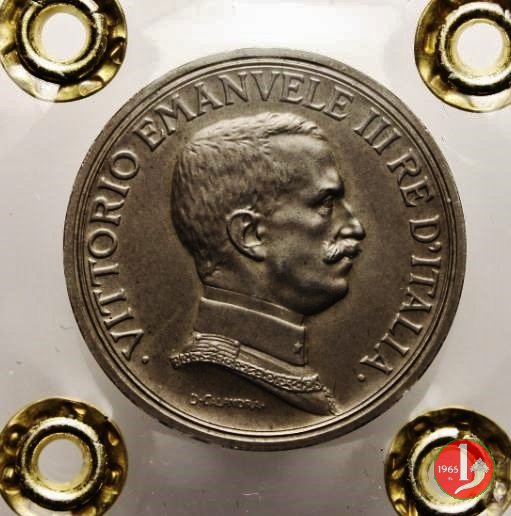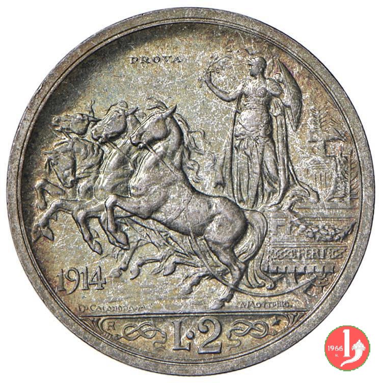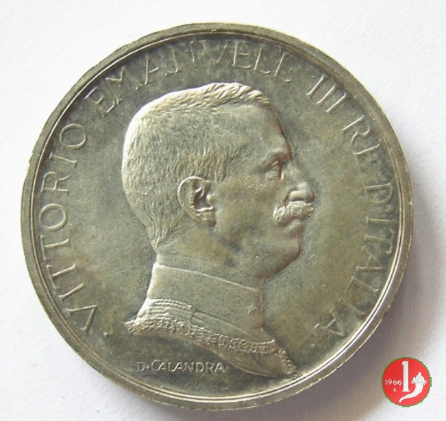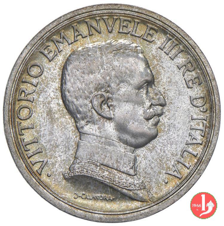 Busto a testa nuda, volto a destra. Intorno, circolarmente VITTORIO EMANVELE III RE D'ITALIA. In basso, il nome dell'autore (D. CALANDRA). Allegoria dell'Italia, recante nella mano sinistra uno scudo e nella destra un ramoscello d'ulivo, su quadriga briosa verso sinistra, ornata da fiori e dal motto FERT, Sotto le zampe dei cavalli la data. Nell' esergo, il valore e due nodi sabaudi (nodo savoia L • 2 nodo savoia), tra il segno di zecca, a sinistra ( R ) e la stella d'Italia, a destra. Al di sopra della linea dell'esergo, a sinistra, il nome dell'autore (D. CALANDRA) e a destra il nome dell'incisore (A. MOTTI INC.)