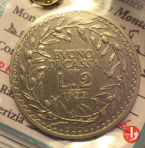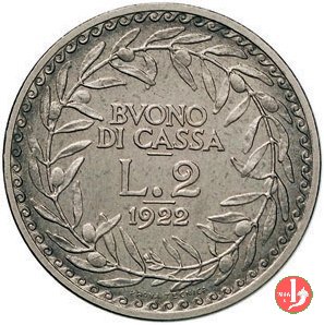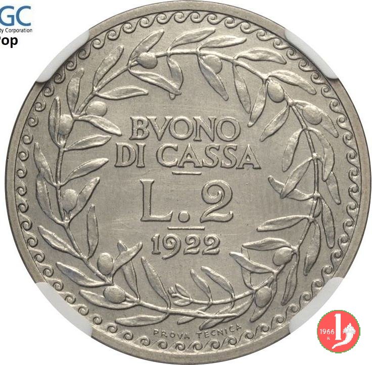 Busto con testa nuda, volto a destra. Intorno, circolarmente "VITTORIO EMANVELE III RE D'ITALIA". Tra le parole della legenda fregi e foglie. In basso a destra M. Nel campo, entro corona di lauro, su quattro righe, il valore e la data (BVONO/ DI CASSA/ L.2/1922). In basso, circolarmente "PROVA TECNICA".