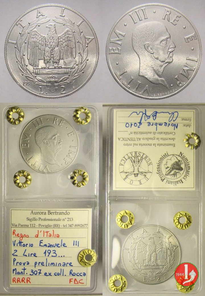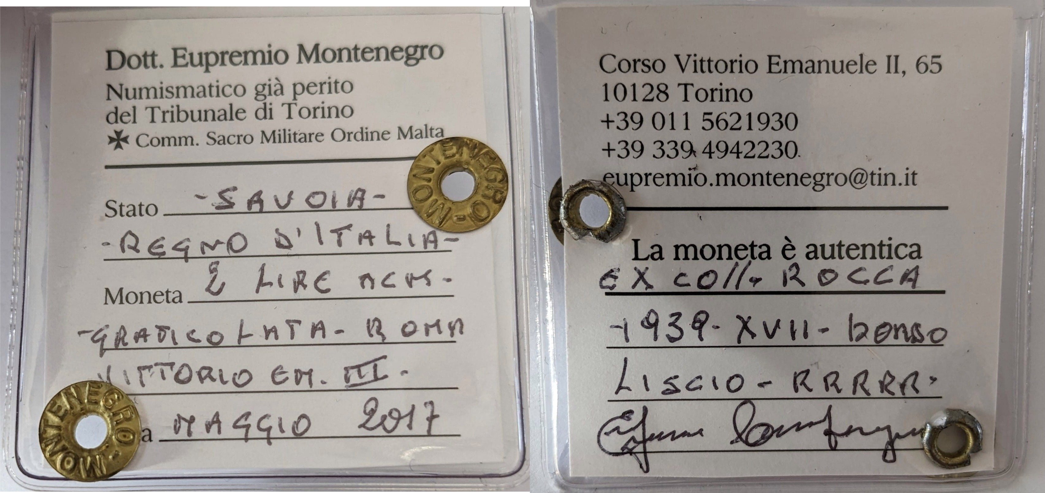 | 1939 XVII | W-V3PR/44-4 ![]() | Roma | Prova in acmonital. Peso 10,27 g. Al D/, sulla testa del re, impressione graticolata. Al R/ bordo largo. Collezione Rocca. | Pagani Prove manca