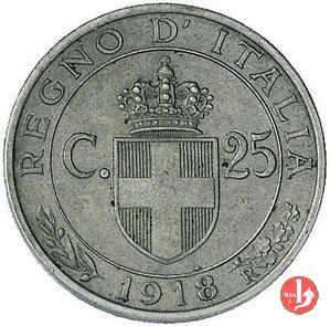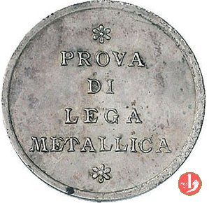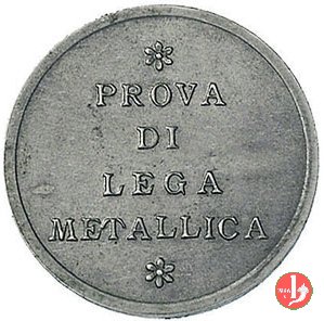 Nel campo, entro cerchio, scudo sabaudo coronato, ai lati del quale l'indicazione del valore (C.//25). Intorno, circolarmente "REGNO D'ITALIA". In basso la data tra due foglie. Nel campo, su sei righe "fiore 6 petali/PROVA/DI/LEGA/METALLICA/fiore 6 petali"