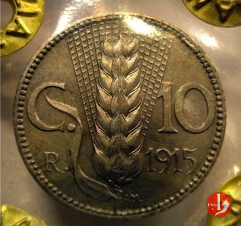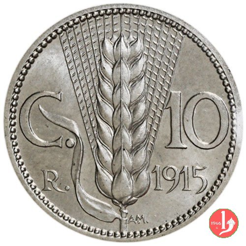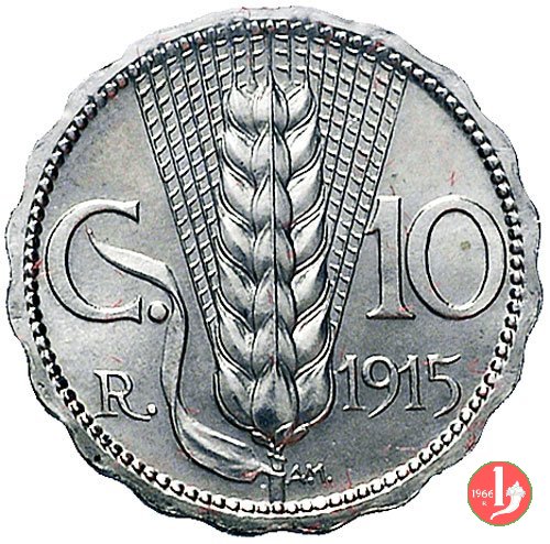 Testa diademata, volta a destra. Intorno "REGNO D'ITALIA" Spiga di grano. Ai lati il valore (C. 10), la data (1915) a destra e il marchio di zecca a sinistra (R). In basso, a destra, la sigla del nome dell'autore (A.M.).