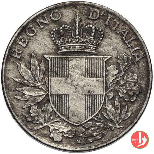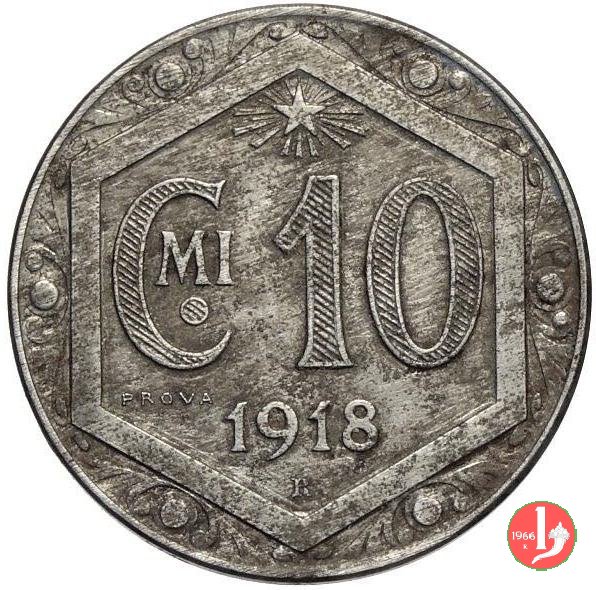 Stemma sabaudo coronato, circondato da rami di lauro e di quercia. In alto, circolarmente, "REGNO D'ITALIA". In basso la sigla dell'autore (A. M.) Esagono ornato da foglie e sei gruppi di tre globetti, entro il quale, in alto è una stella fiammeggiante, e in basso, su due righe, l'indicazione del valore e la data (C.MI 10/ 1918). Nel campo, a sinistra, scritto orizzontalmente "PROVA".
