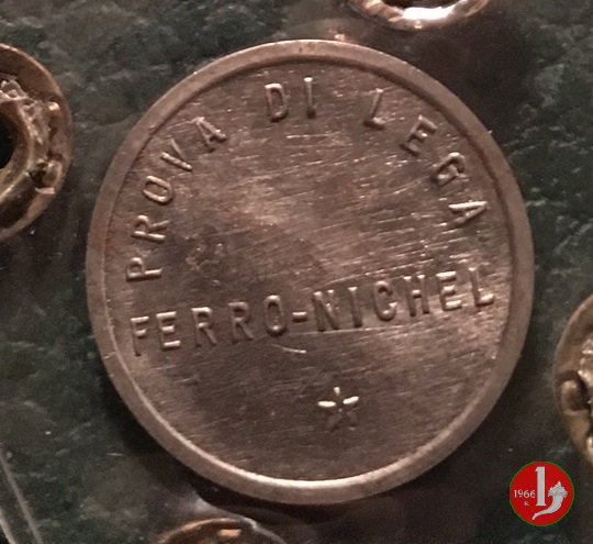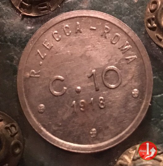 In alto, circolarmente, "R. ZECCA - ROMA". Nel campo, su due righe, l'indicazione del valore e la data (C. 10/ 1918), con tre globetti lungo il bordo, in basso. In alto, circolarmente, "PROVA DI LEGA". Nel campo, "FERRO NICHEL". In basso stella a cinque punte.