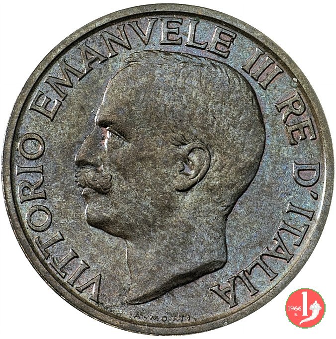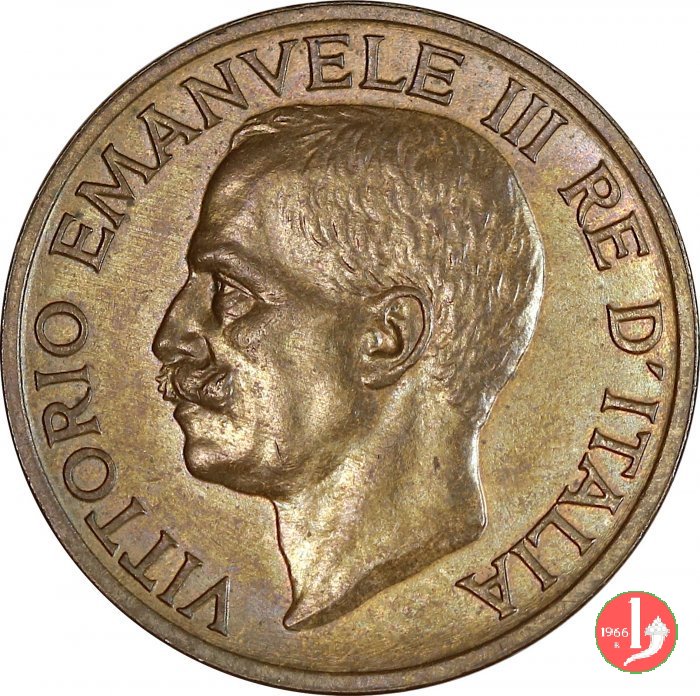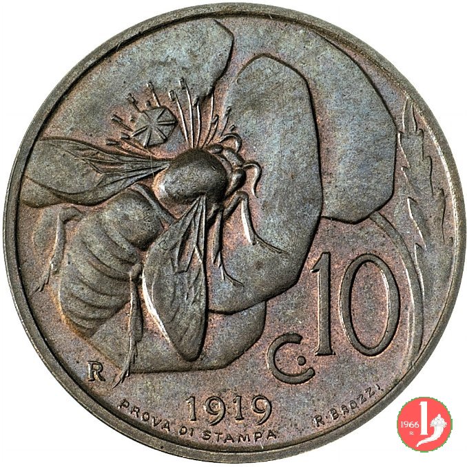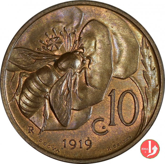 Testa nuda, volta a sinistra. Intorno, circolarmente "VITTORIO EMANVELE III RE D'ITALIA". Ape su fiore. A sinistra, in basso, la sigla di zecca ( R ), a destra l'indicazione del valore (C.10) e in basso la data. Lungo il bordo, in basso a sinistra la dicitura "PROVA", e a destra il nome dell'autore del R/ (R. BROZZI).