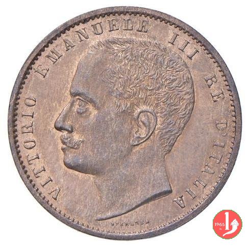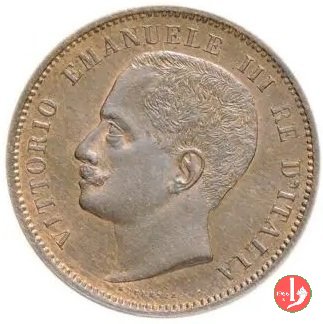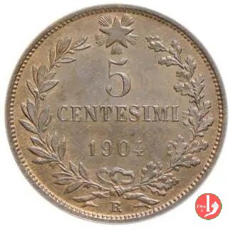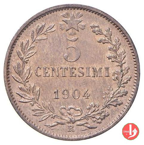 Test nuda volta a sinistra. Intorno, circolarmente "VITTORIO EMANVELE III RE D'ITALIA". In basso il nome dell'autore e incisore (SPERANZA). Nel campo, tra rami di lauro e quercia, su tre righe, l'indicazione del valore e la data (5/ CENTESIMI/1904). In alto stella raggiante, legata in basso da due rami. Sotto la legatura il segno di zecca ( R ).