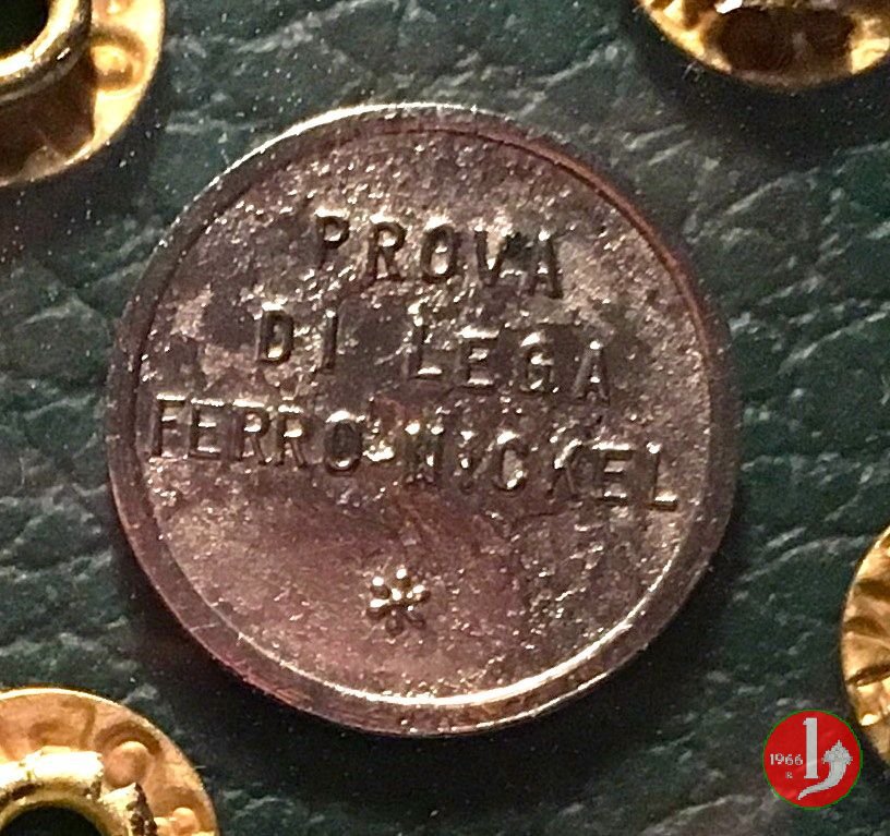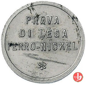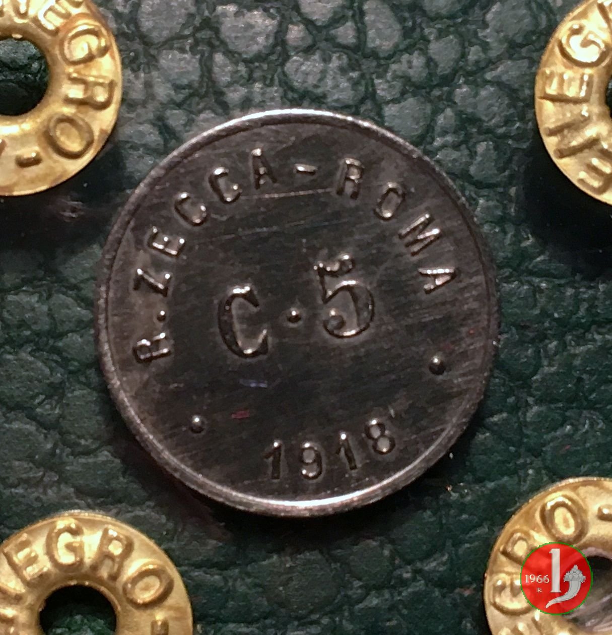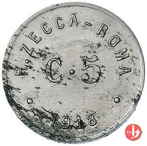 In alto, circolarmente "R. ZECCA - ROMA". Nel campo, su due righe il valore e la data (C. 5/ 1918), con tre globetti, in basso, lungo il bordo. In alto, circolarmente "PROVA DI LEGA". Nel campo, "FERRO NICHEL". In basso, stella a cinque punte.