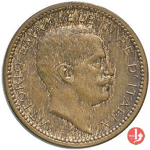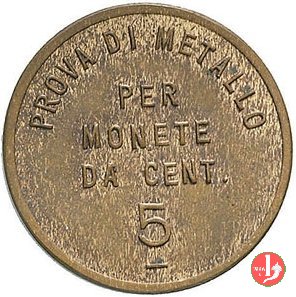 Testa nuda, volta a destra. Intorno, circolarmente "VITTORIO EMANVELE III RE D'ITALIA". In alto, circolarmente "PROVA DI METALLO". Nel campo, su quattro righe "PER / MONETE / DA CENT. / 5 / - ".