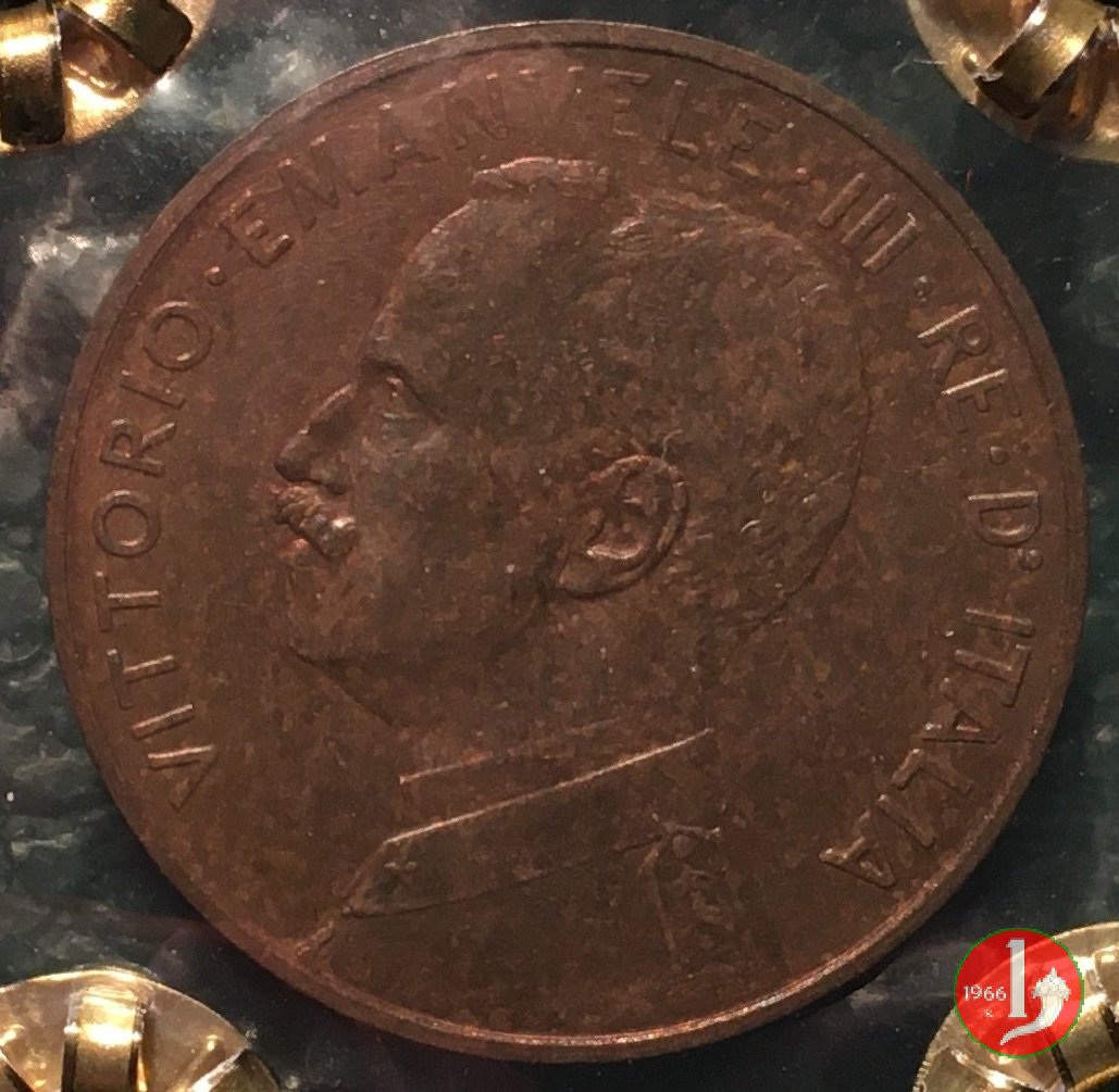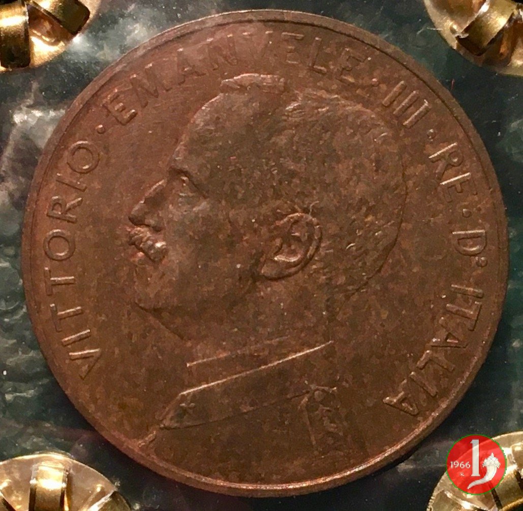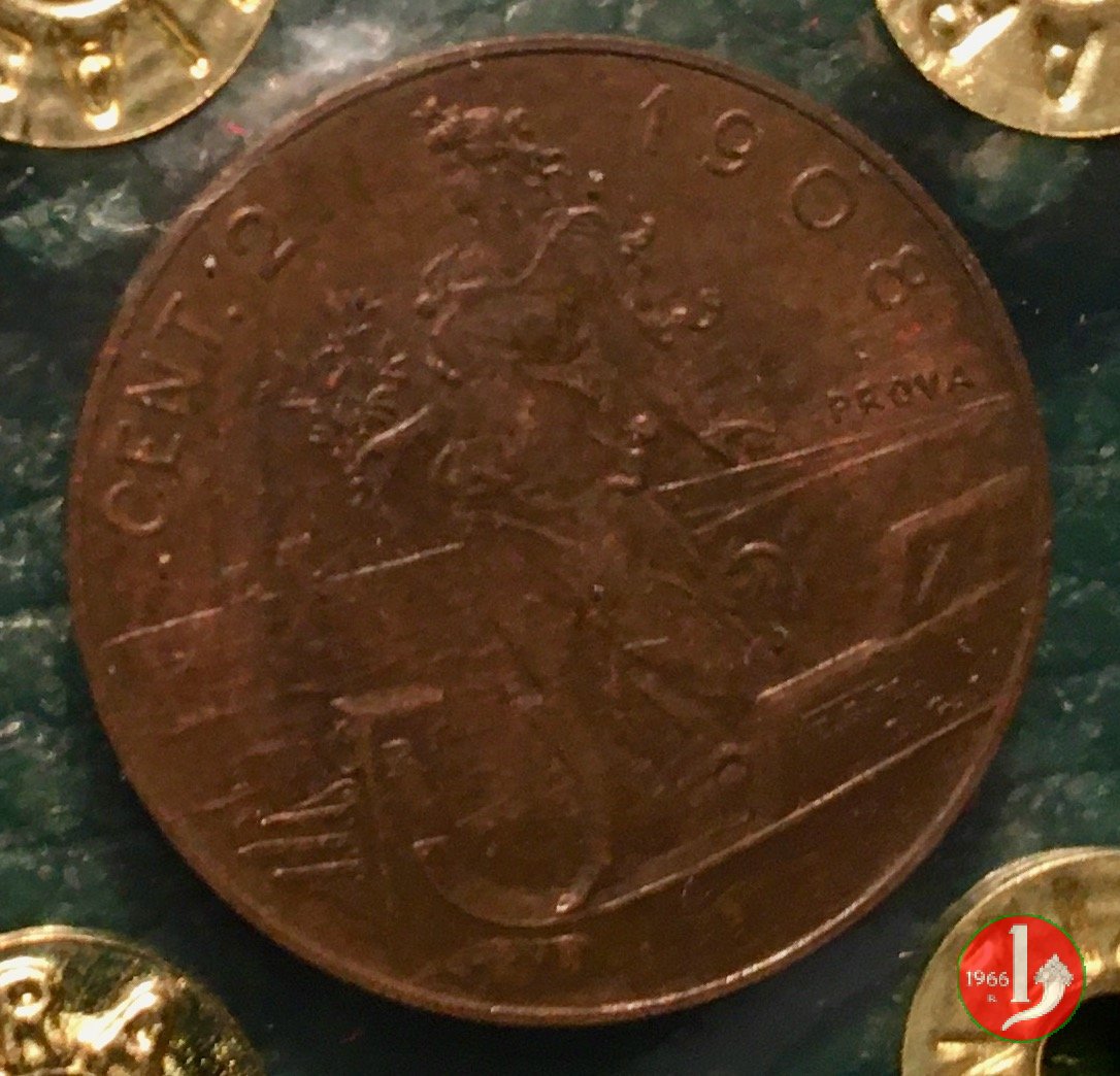 Semibusto volto a sinistra, a testa nuda, in uniforme. Intorno, circolarmente "VITTORIO • EMANVELE • III • RE • D'ITALIA •" Allegoria dell'Italia, recante nella mano destra un ramo di ulivo, su prora a sinistra. In alto, circolarmente il valore, a sinistra, (CENT. 2) e a destra il millesimo. Sulla prora il segno di zecca ( R ) e sulla fiancata, su due righe le sigle dei nomi dell'autore (P. C. M.) e dell'incisore (L. G. I.).